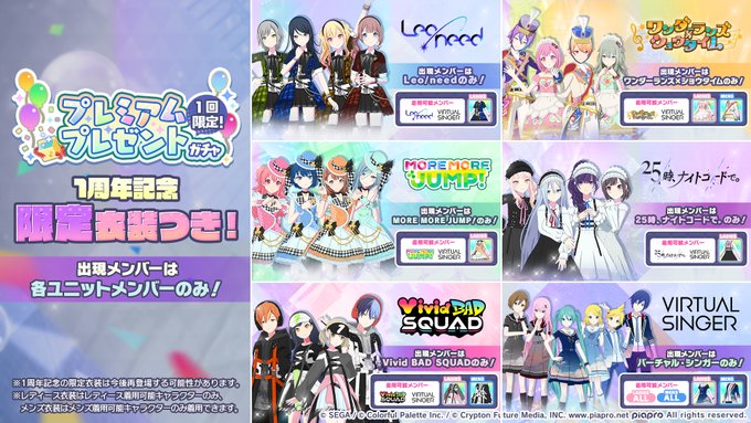 1周年限定衣装やユニット専用衣装がおまけとしてついてくるガチャになります🌈