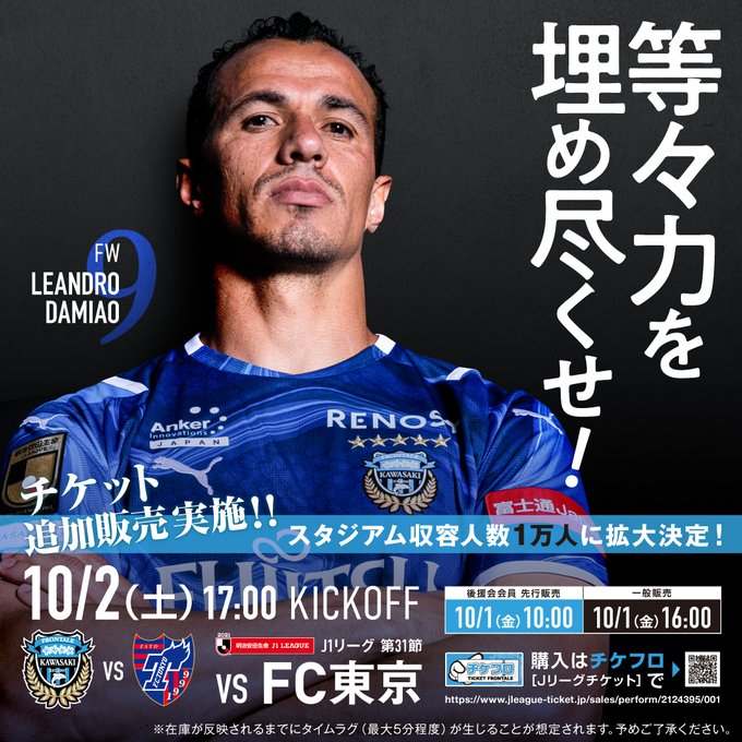 緊急事態宣言解除に伴い10/2FC東京戦のチケット追加販売を行います‼️