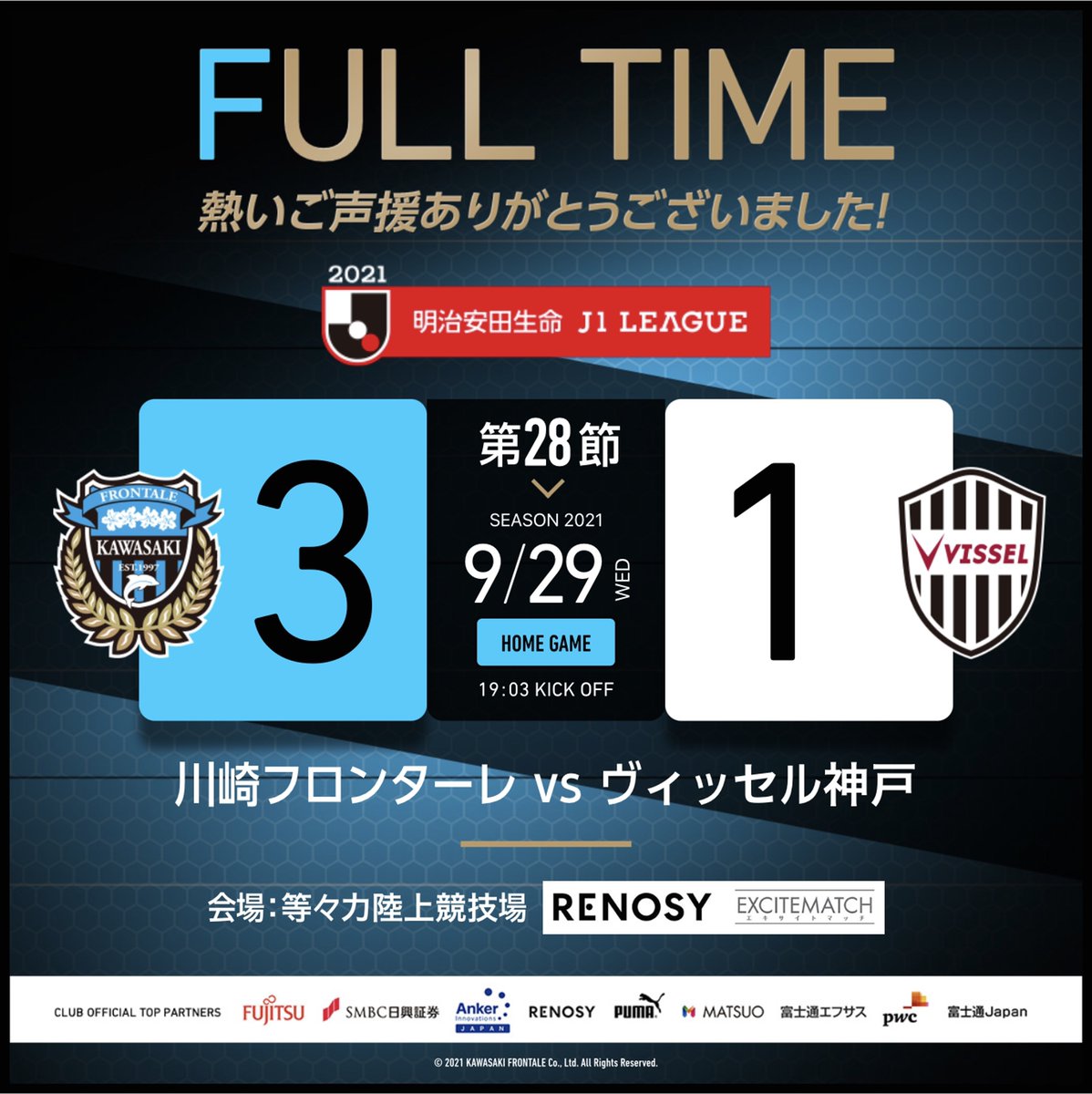 等々力での嬉しい勝利。日付が変わって、ようやく家族に会える日が来ました。良い準備をして、またパワーアップして等々力に帰ってきます。今日もありがとうございました!【広報】#frontale pic.twitter.com/DWnVJz4z2x