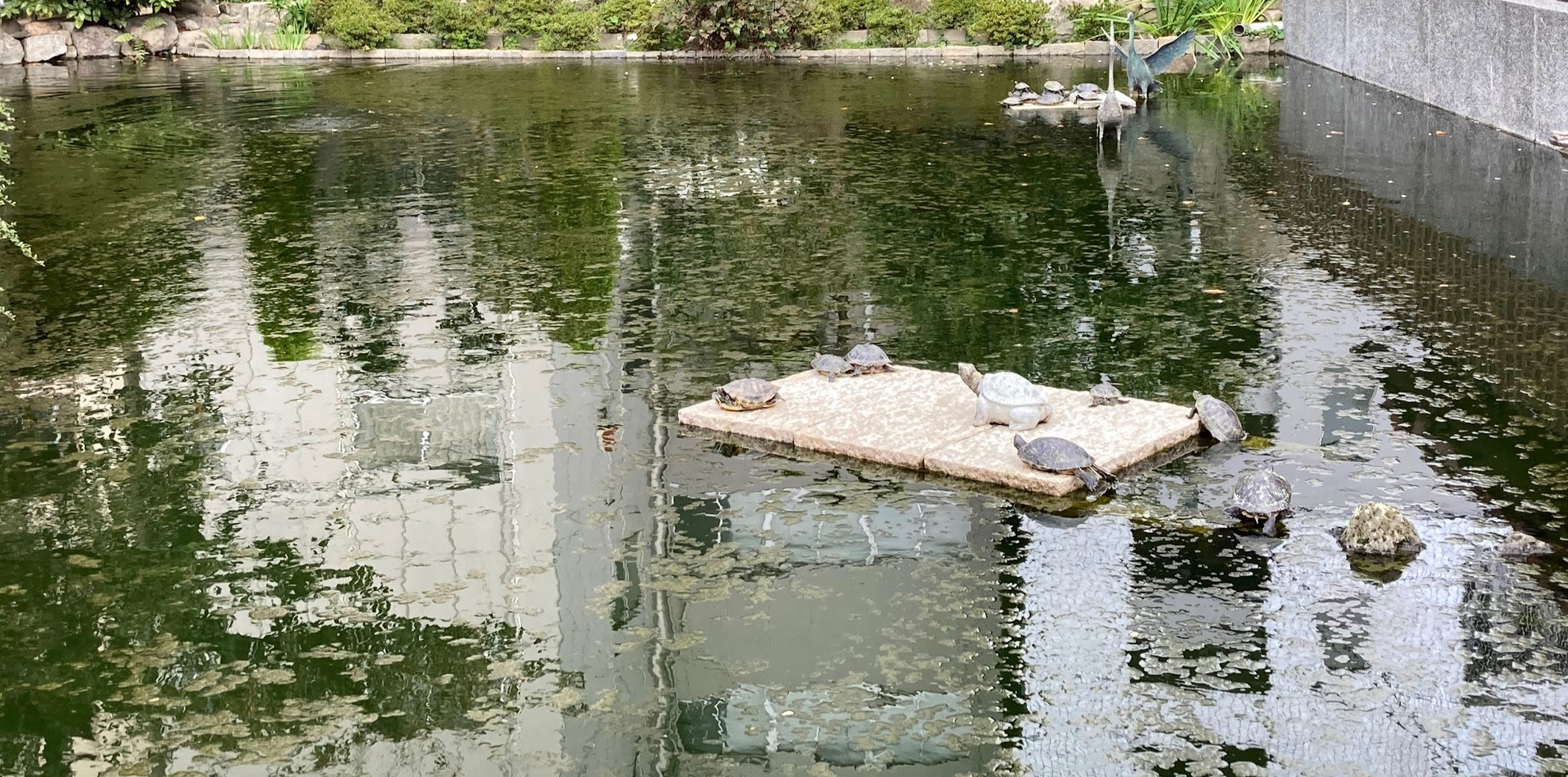 以前、本物と置物の区別がつかなかった、大阪天満宮そばの亀の池。先日、改めて確認したら、噴水がなくなっていて、土台も新しくなっていました。もう一目瞭然だけど、ちと寂しい。むしろ、奥のが気になってきた…