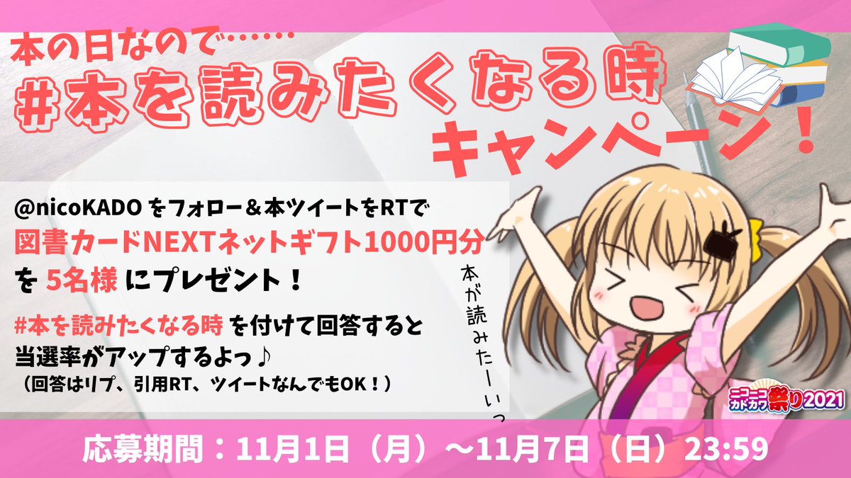 @nicoKADO をフォロー&本ツイートRTで、図書カードNEXTネットギフト1000円分を5名様にプレゼント🎉