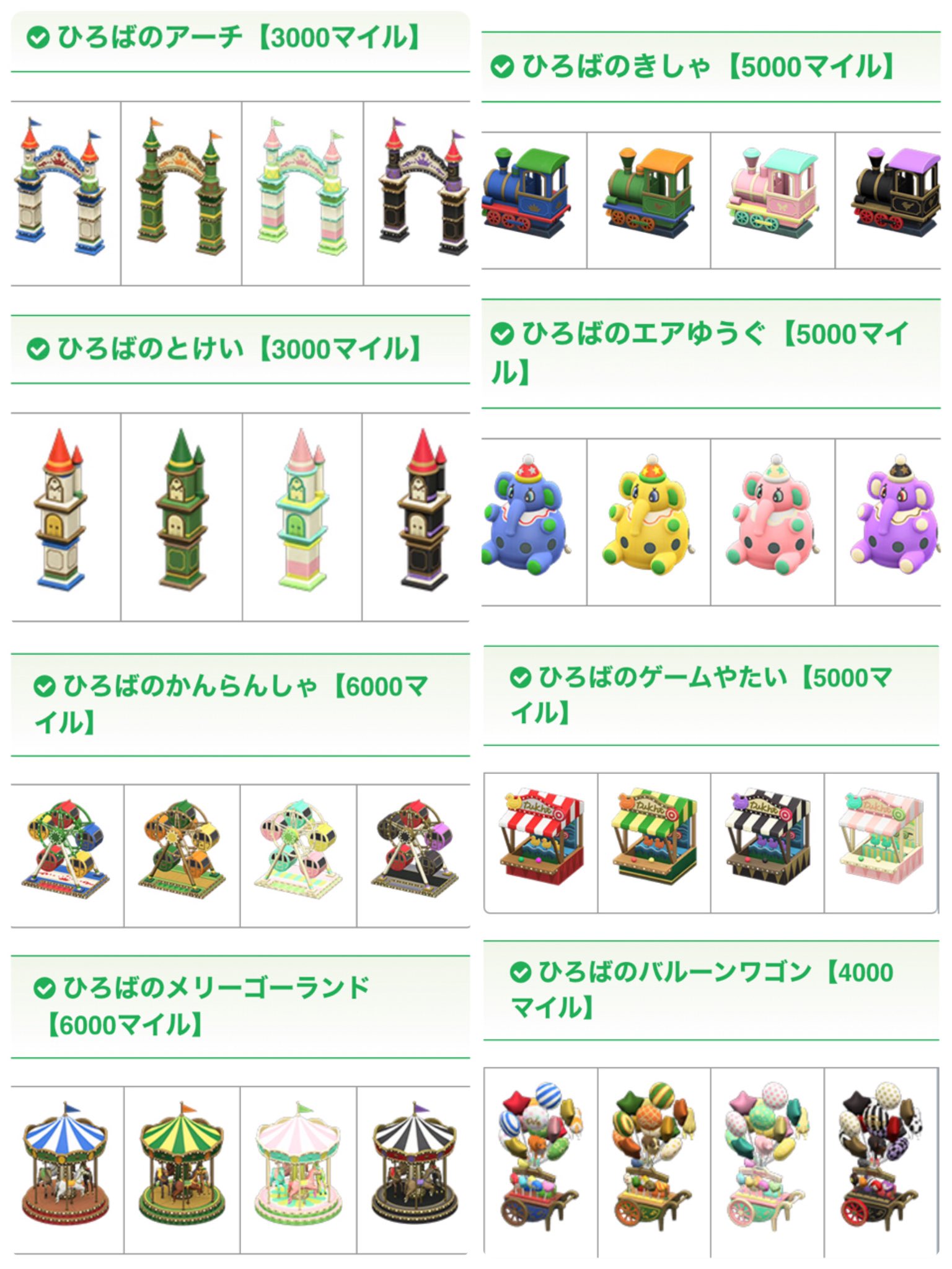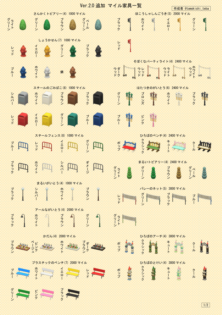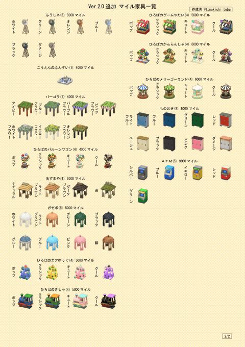 Ver.2.0で追加されたマイル家具(29種)一覧です。
