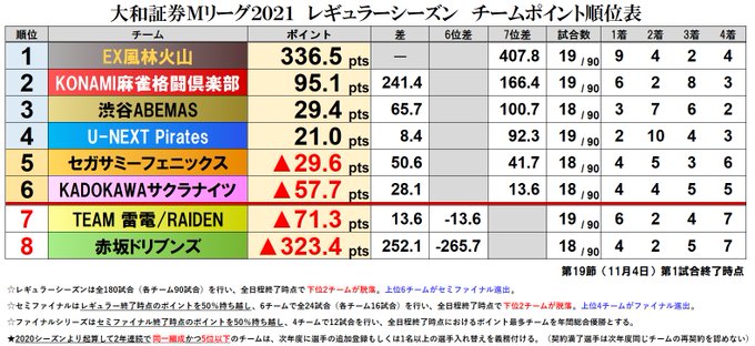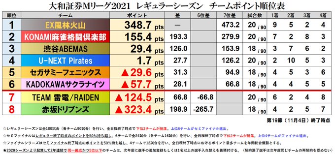 大和証券 #Mリーグ 2021【チーム成績順位表】