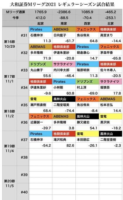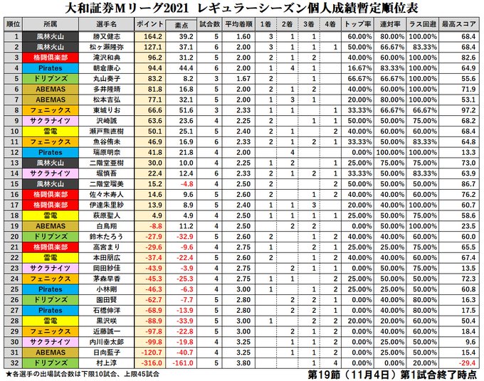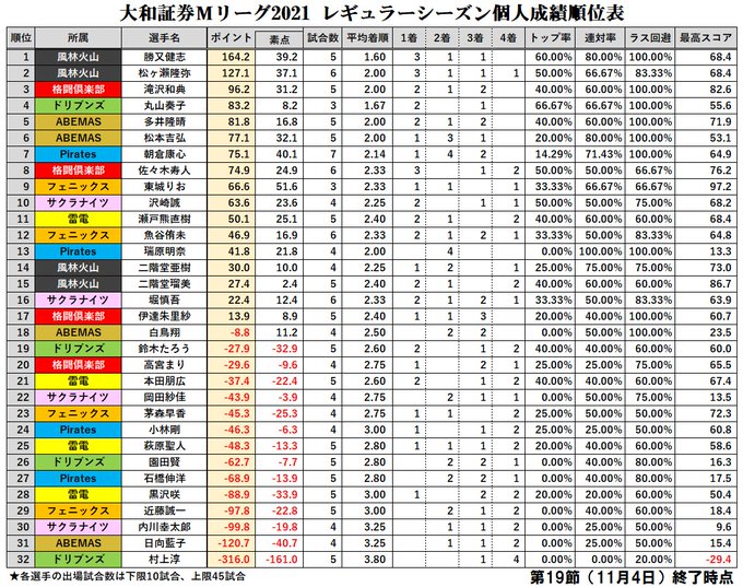 大和証券 #Mリーグ 2021【個人成績順位表】