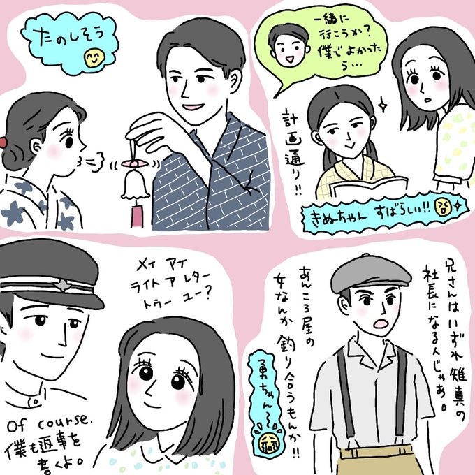 きぬちゃんみたいに誰かの恋路をスマートに応援したいと思いました。かっこよかったですきぬちゃん。#カムカムエヴリバディ #カムカム #カムカム絵 #絵ヴリバディ #小野花梨 #松村北斗