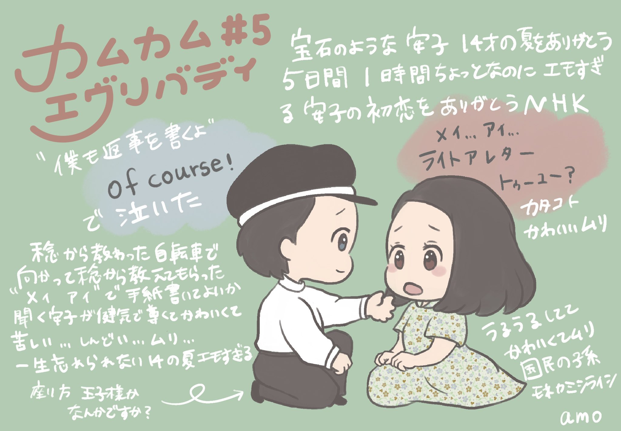 どの場面も情景と見事にマッチして、それぞれの心情が手に取るように分かる。勇の嫉妬と反省、きぬの絶妙アシスト、あえて自転車で駅へ向かう安子…もう美しいったらありゃしない。稔と英語で文通の約束して終り来週へ引き摺らない。きゅんきゅんしかない作劇に萌え! #カムカム #カムカムエヴリバディ