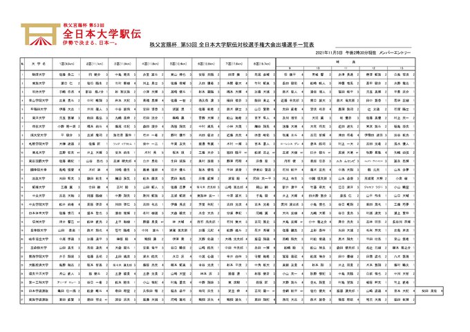 全日本大学駅伝の出走順(11月5日午後2時半現在)です。大会当日朝に、3人まで変更が可能です。公式ホームページ(daigaku-ekiden.com)でも公表しています。