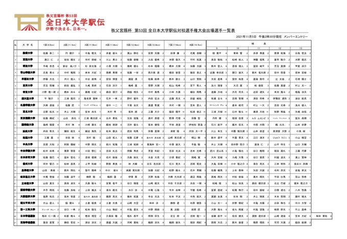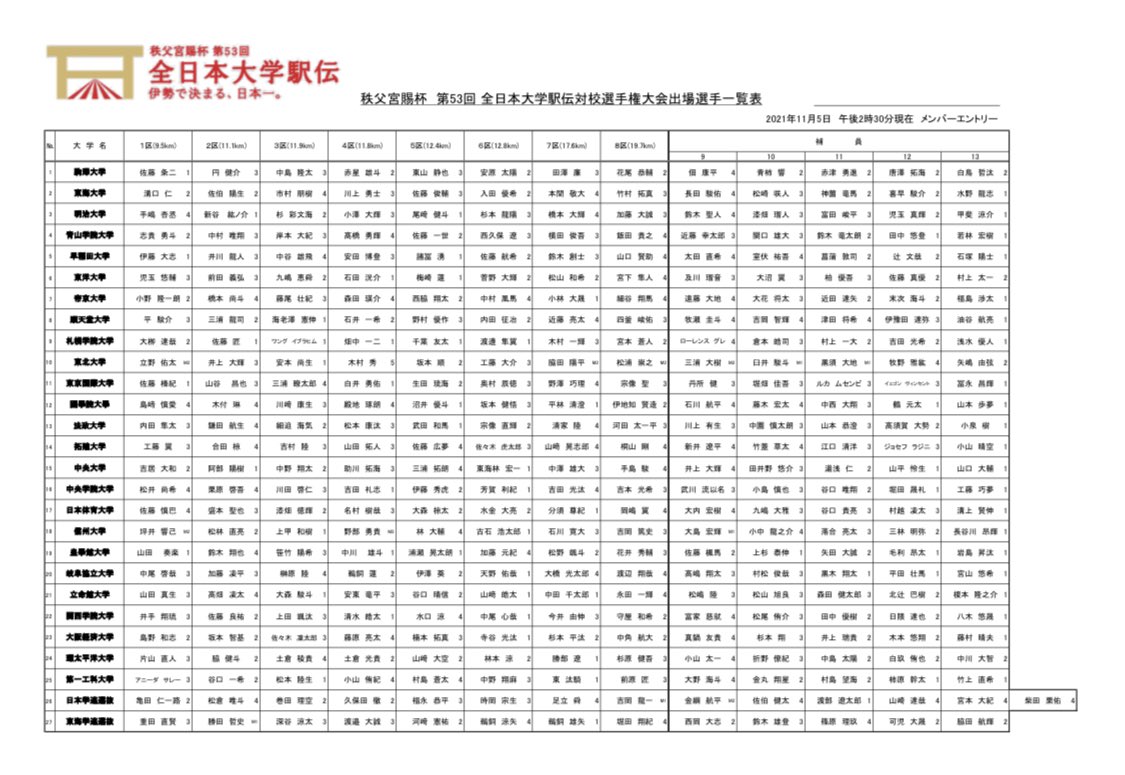 11月7日(日)に行われる #全日本大学駅伝 (愛知・熱田神宮〜三重・伊勢神宮)の区間エントリーが発表されました。