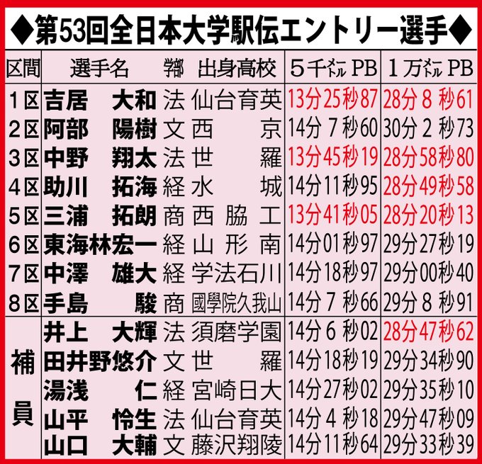 #全日本大学駅伝 区間エントリー