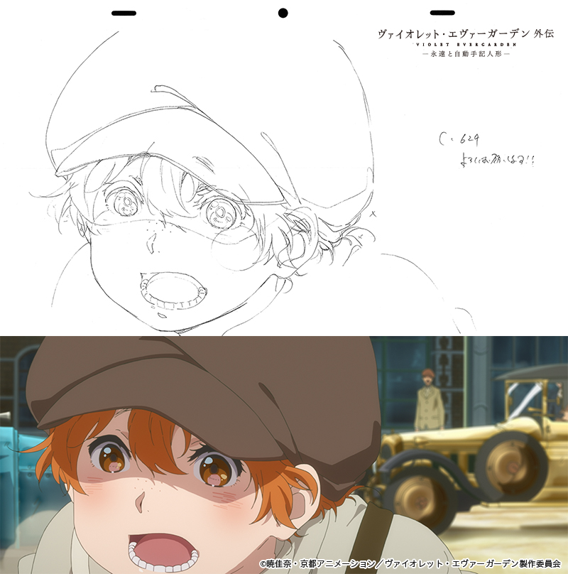 このシーンでは、TVシリーズのシーンが1カットだけ使われています。監督は「ヴァイオレットの成長を描きたい」と考えたそうで、完成したシーンを見て「ホッジンズと同じ気持ちになった…」と語っています(Blu-ray/DVDブックレットより)