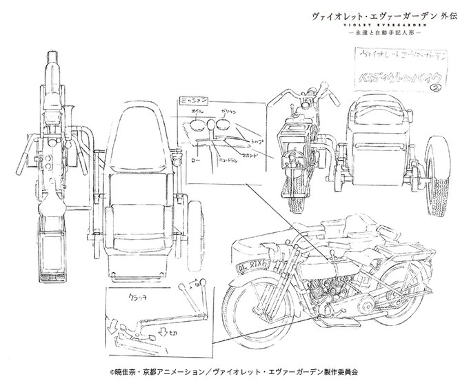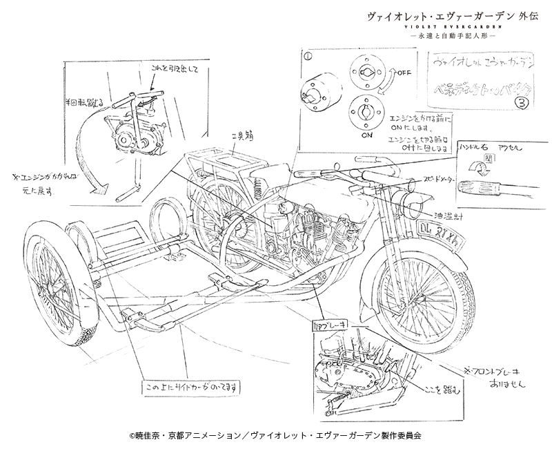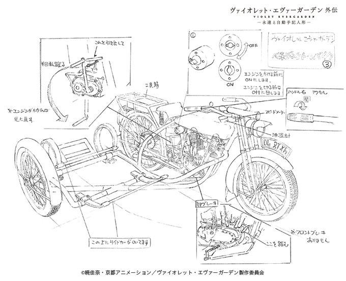 ベネディクトの愛車の設定です。構造や部品の意味、エンジンのかけ方、設定にはアニメーターが絵を描くために必要な情報が満載✏
