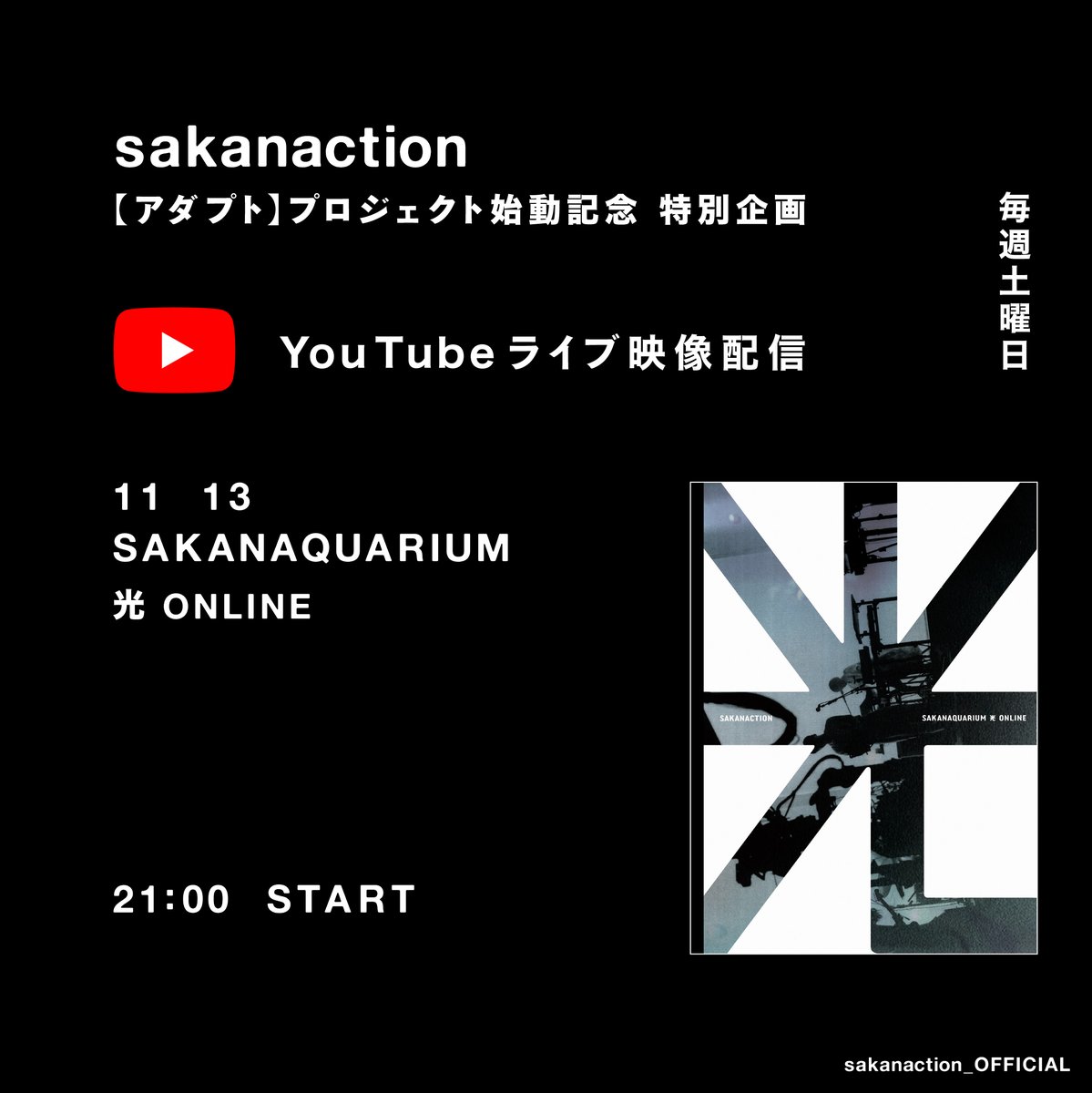 「SAKANAQUARIUM アダプト ONLINE」までの毎週土曜日21時からYouTubeでライブ映像作品を配信します。