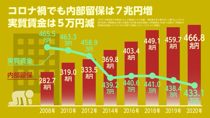 日本の大企業は利益を出しても、従業員に還元せずに内部留保として貯め込んできたんだよね。