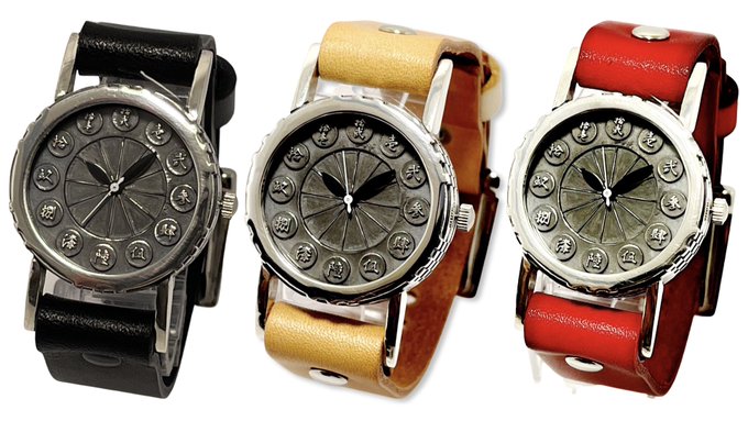 大字(だいじ)を刻んだ文字盤に革バンドはブラック、レッド、ナチュラルの3色です。