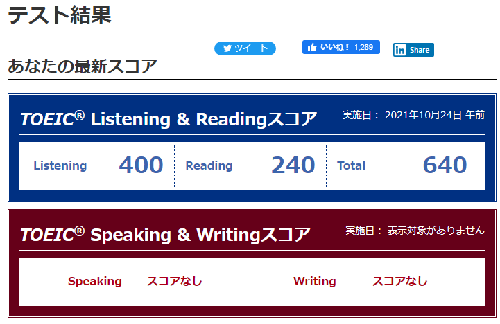 TOEICの結果、640点でした!!!