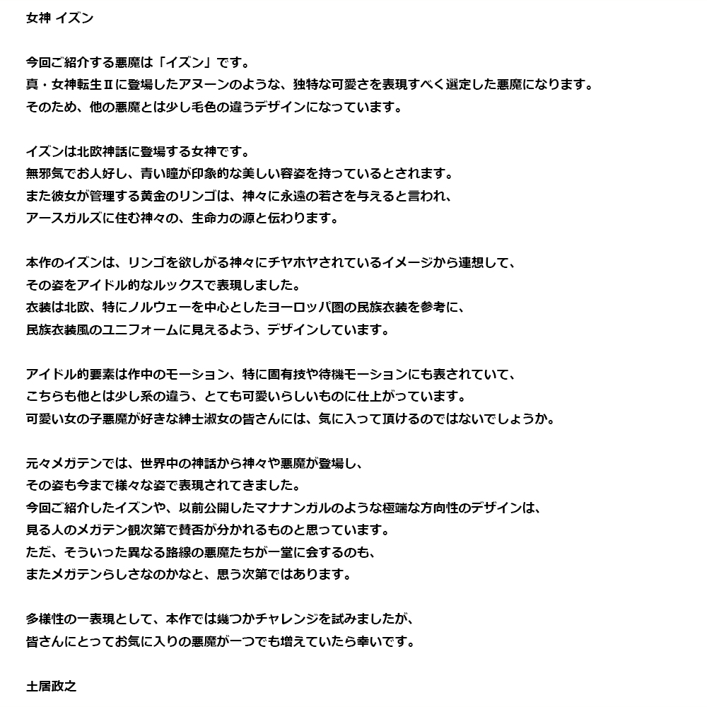 本作に登場する、土居描き下ろし悪魔の紹介企画!今回は #真V の新規悪魔、女神「イズン」について紹介します。ぜひご覧ください。
