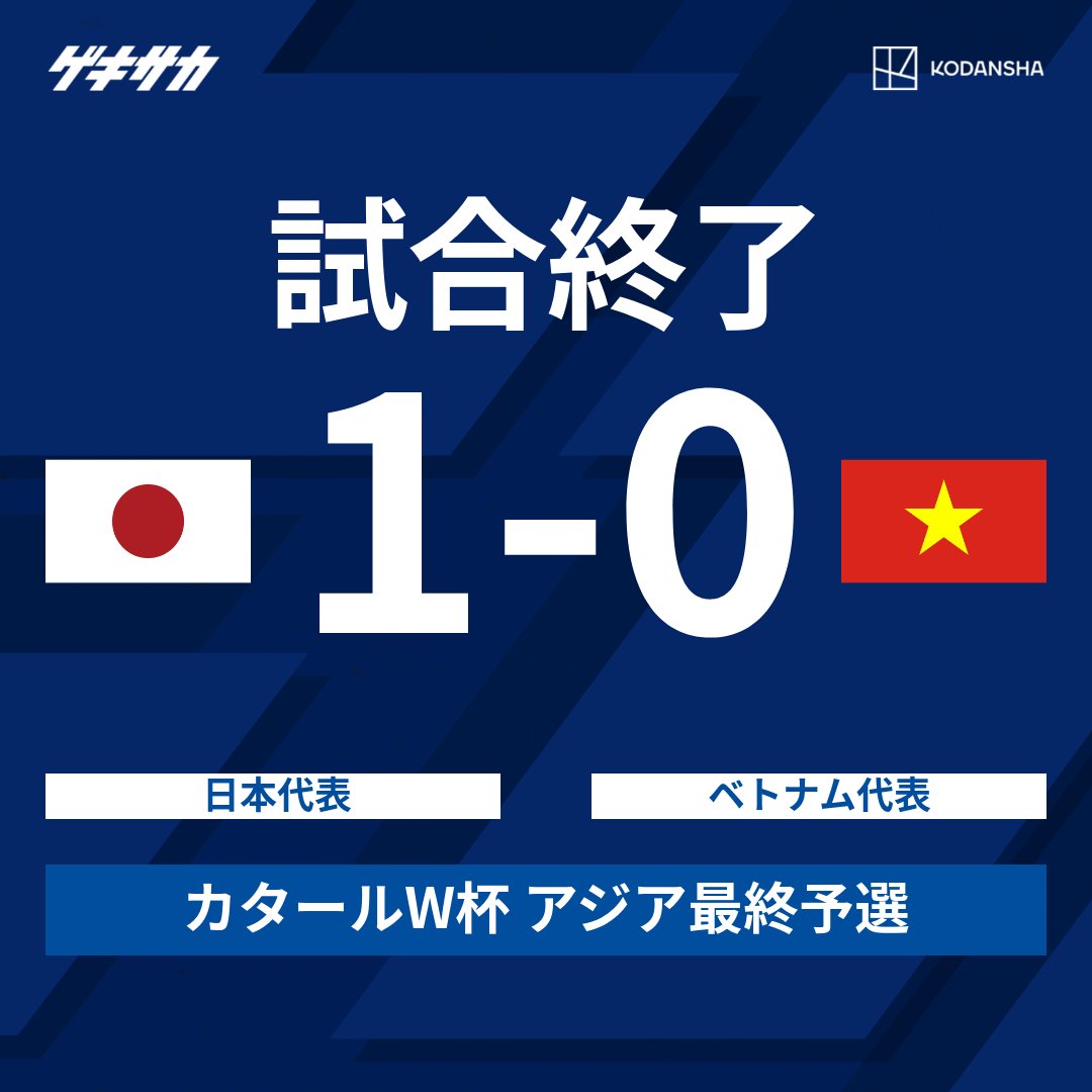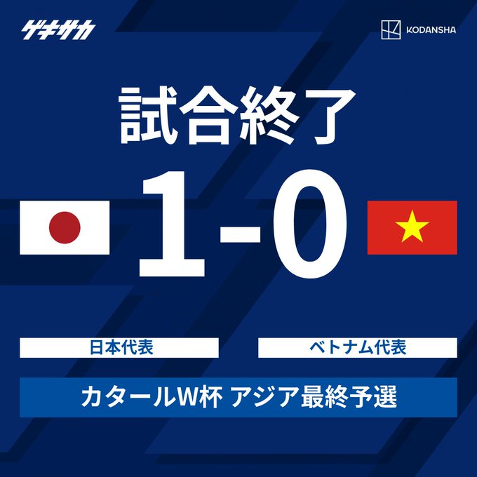 1 - 日本はベトナム戦に勝利し(1-0)、今アジア最終予選では初の連勝。同最終予選のスコアはすべて1点差(3勝2敗)。