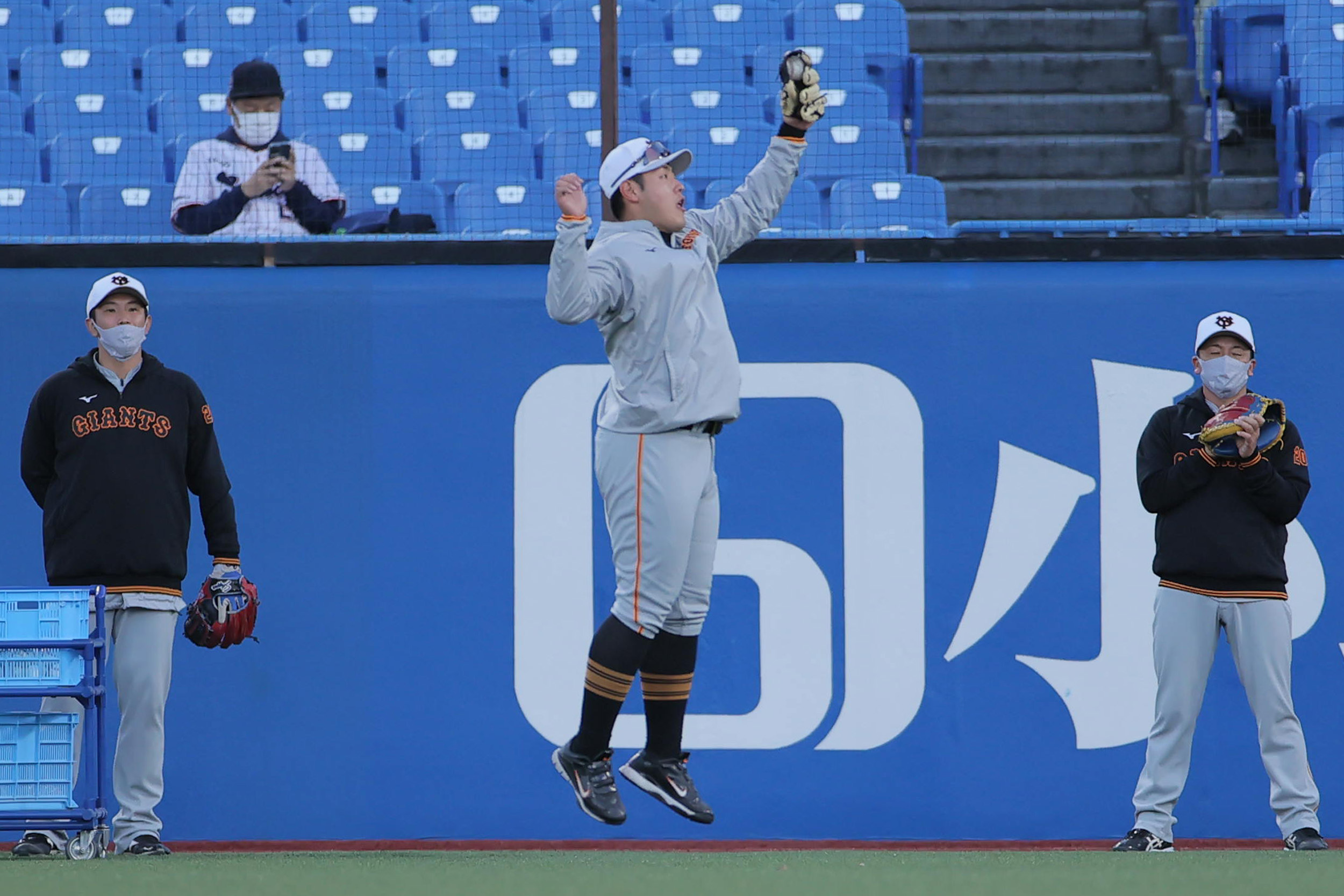 #岡本和真 選手は今日も欠場しますが、ジャンピングキャッチを見せる場面も(撮影・福島範和、中井誠)