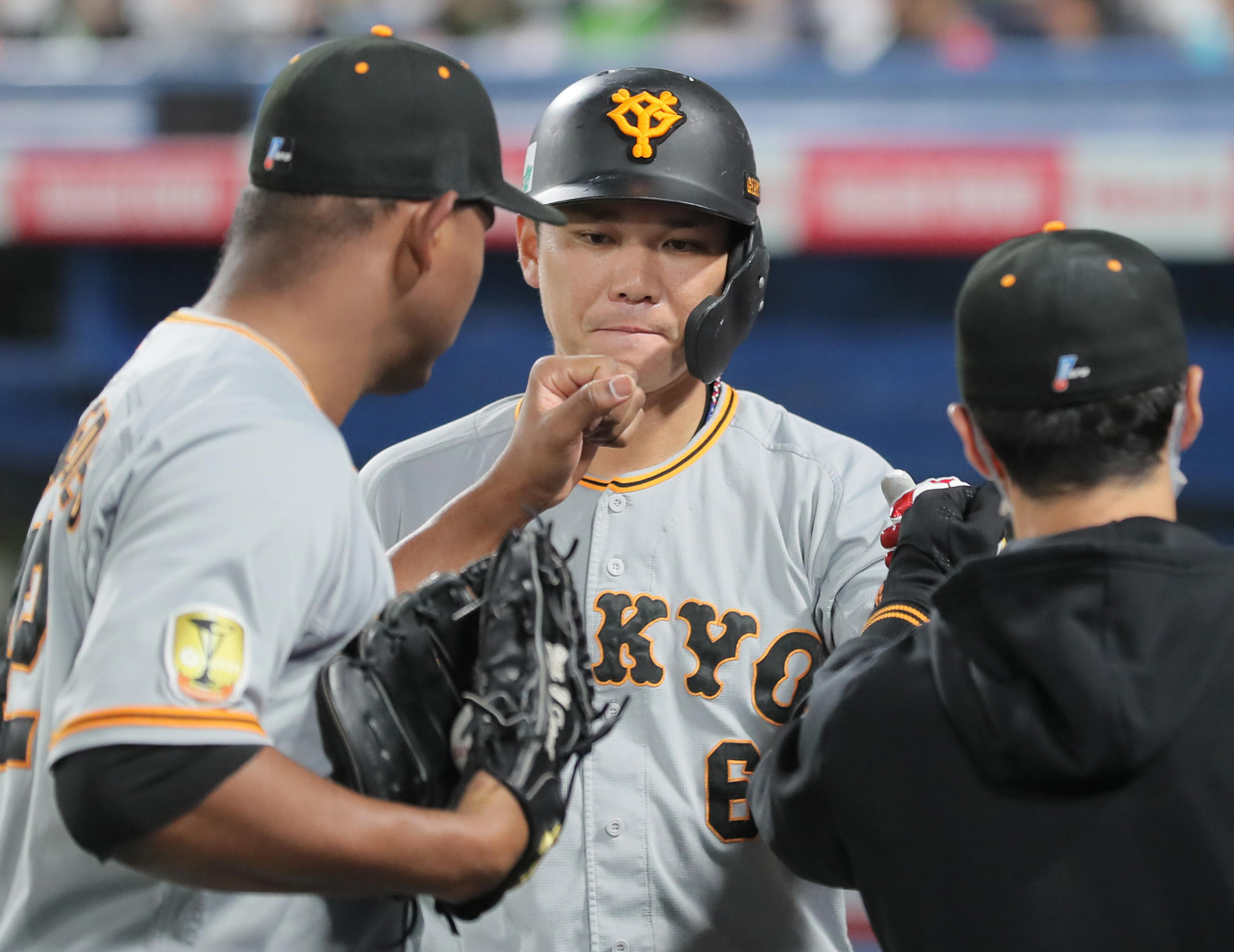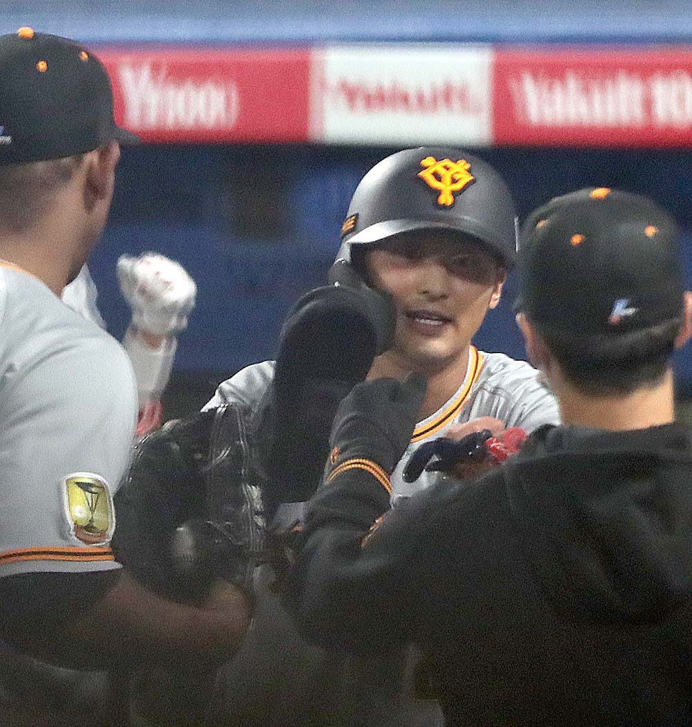 #坂本勇人 選手が先制の犠牲フライ。先発の #メルセデス 投手もグータッチで迎えた👊(撮影・中井誠)