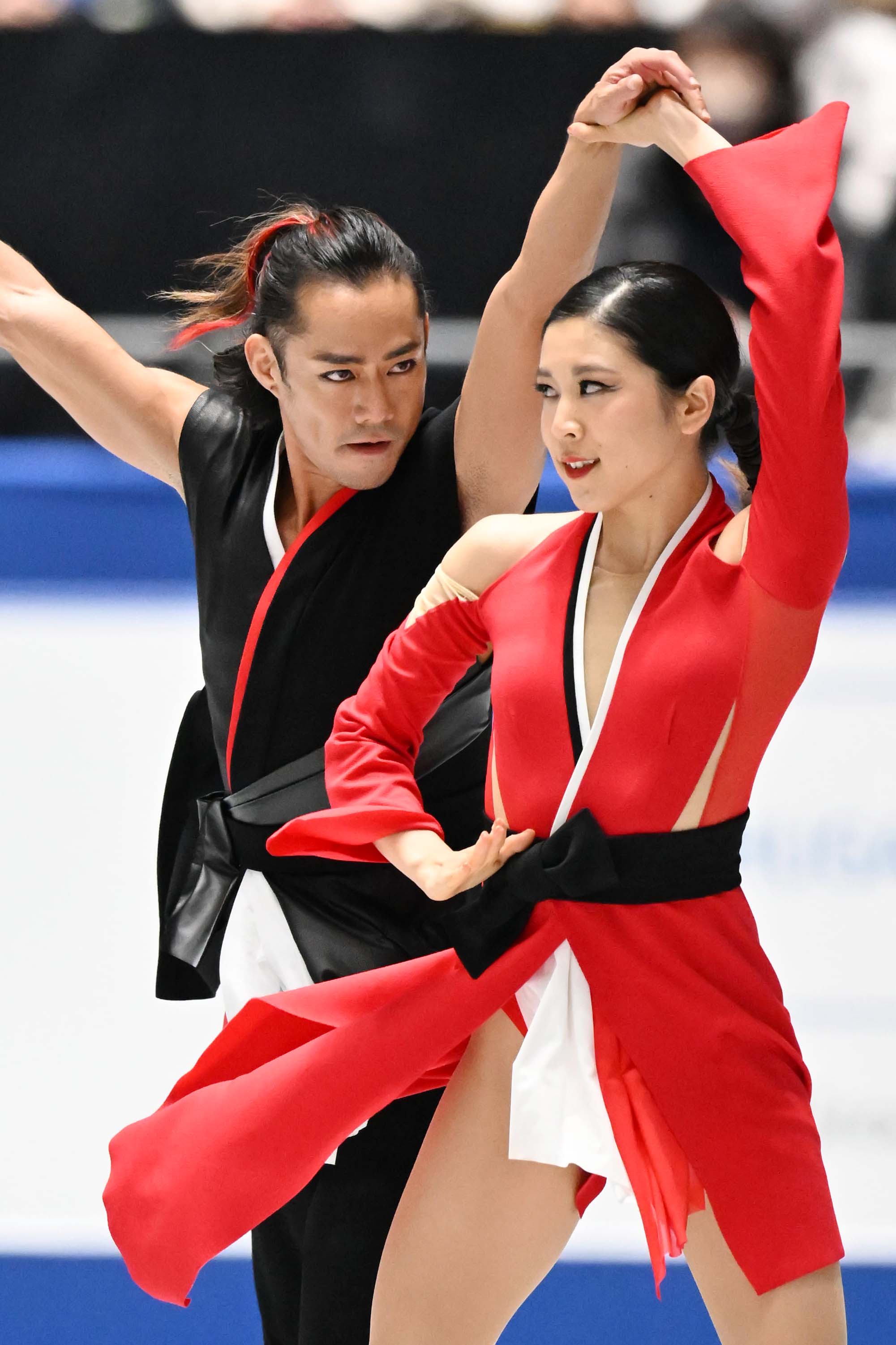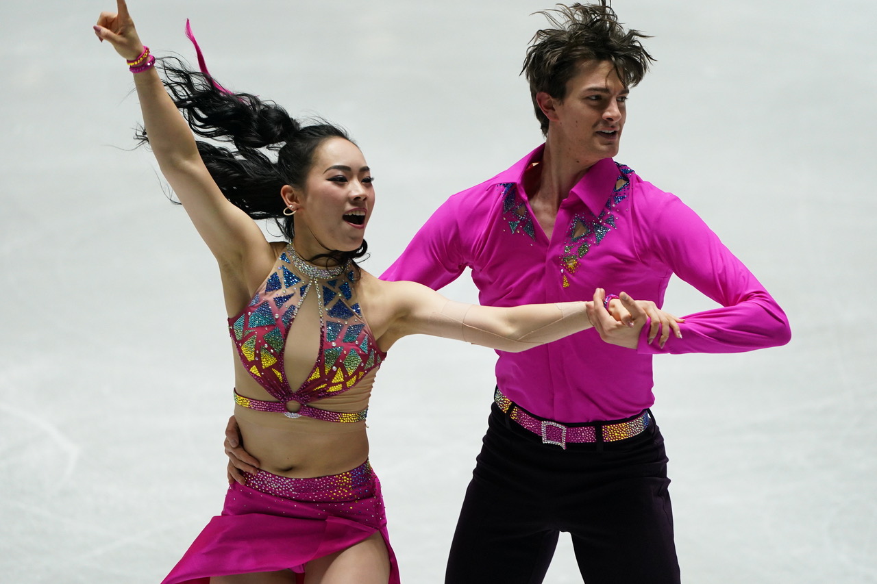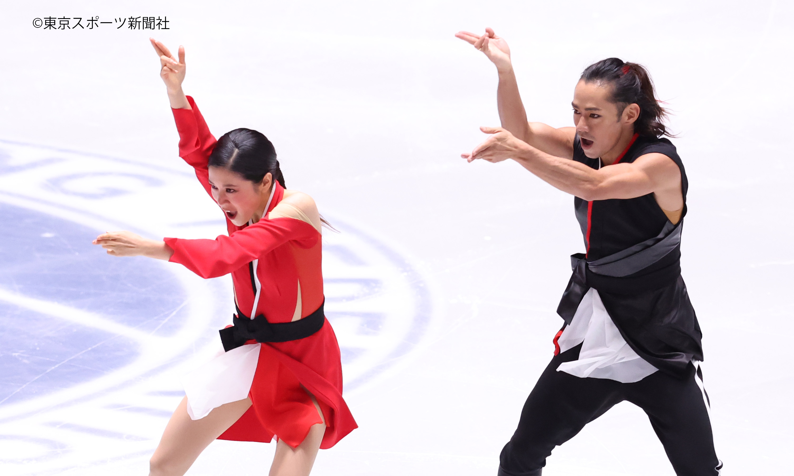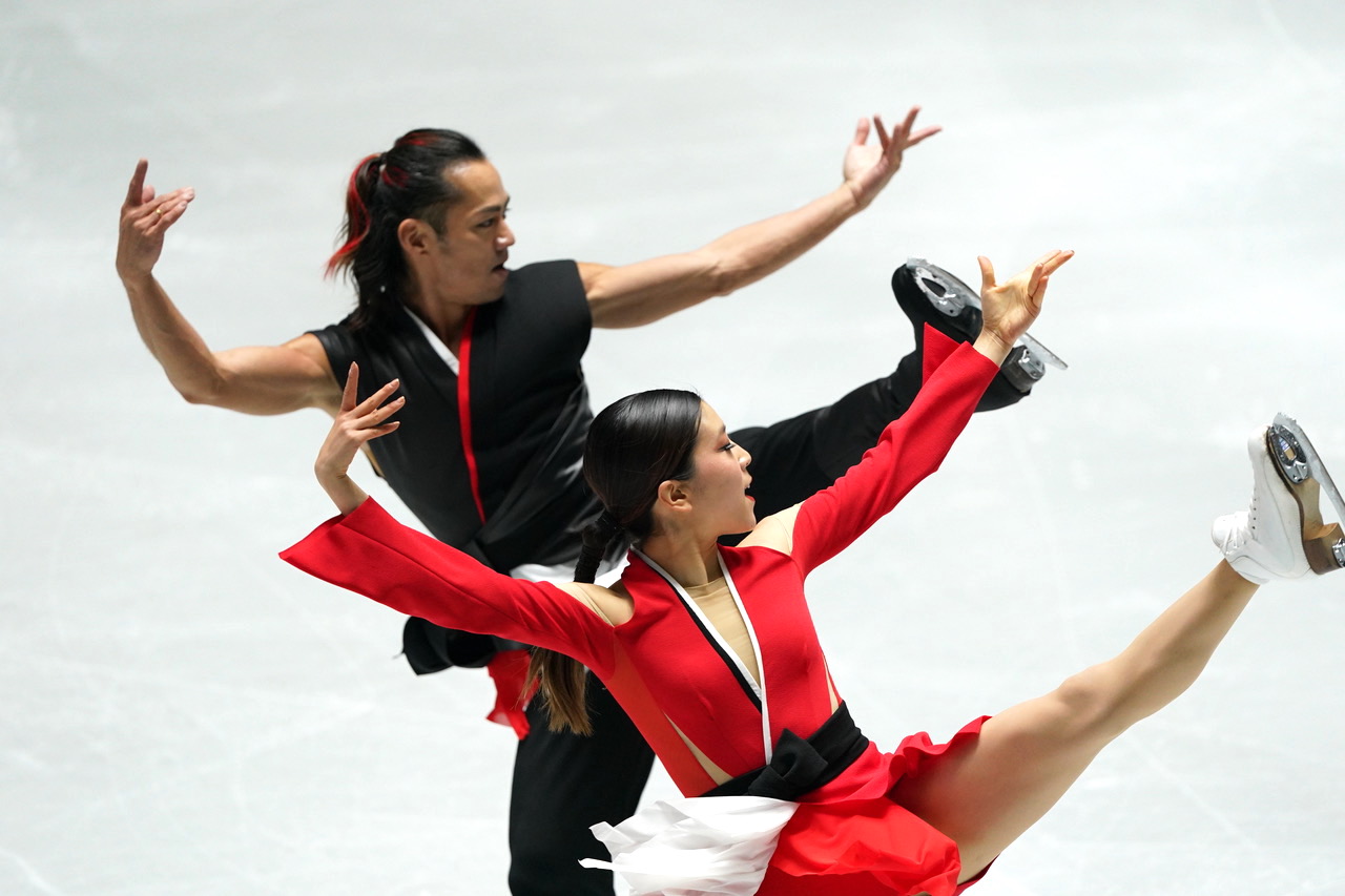 村元選手は赤、髙橋選手は黒の衣装。中盤は流しつつ、序盤とヒップホップの終盤は息のあった演技。