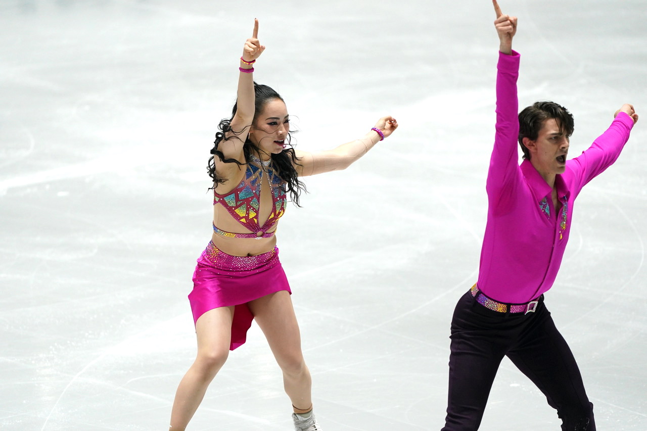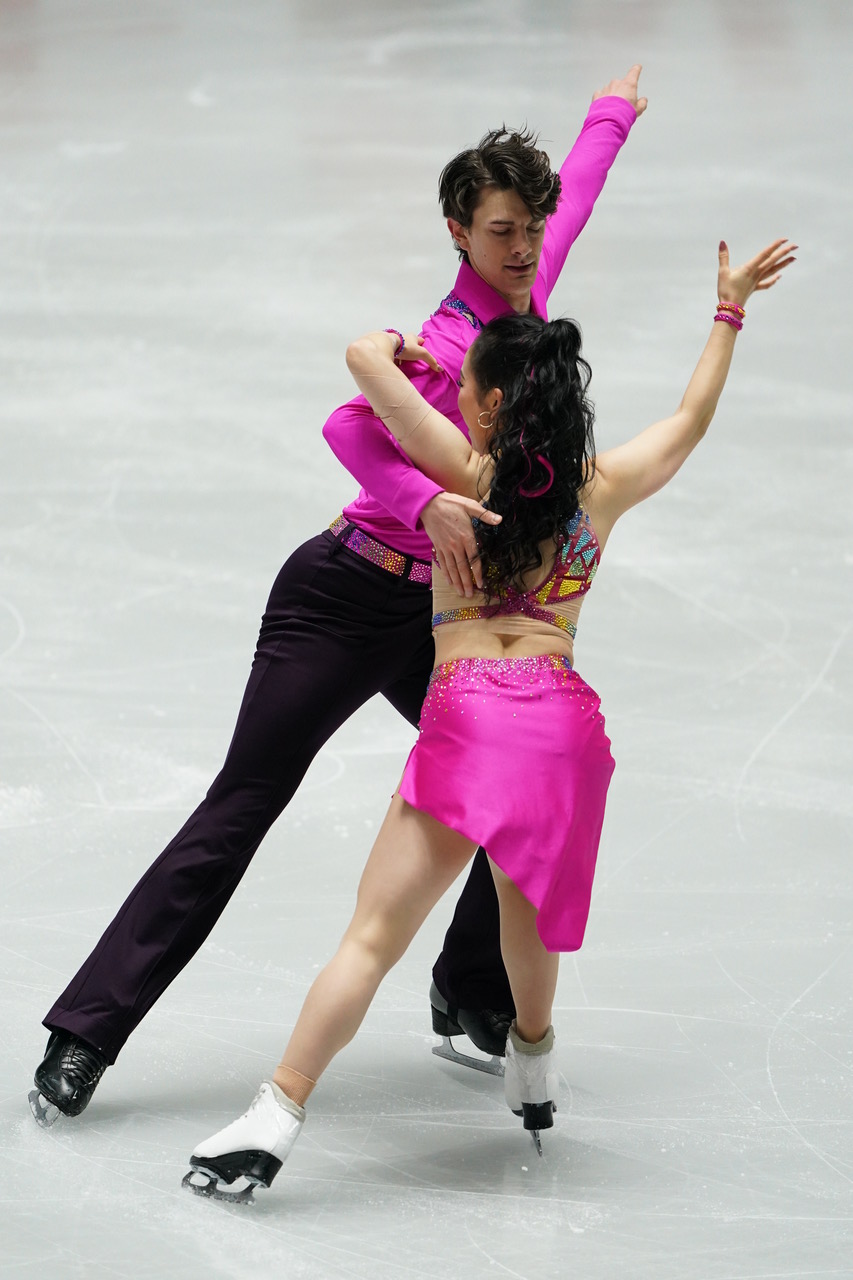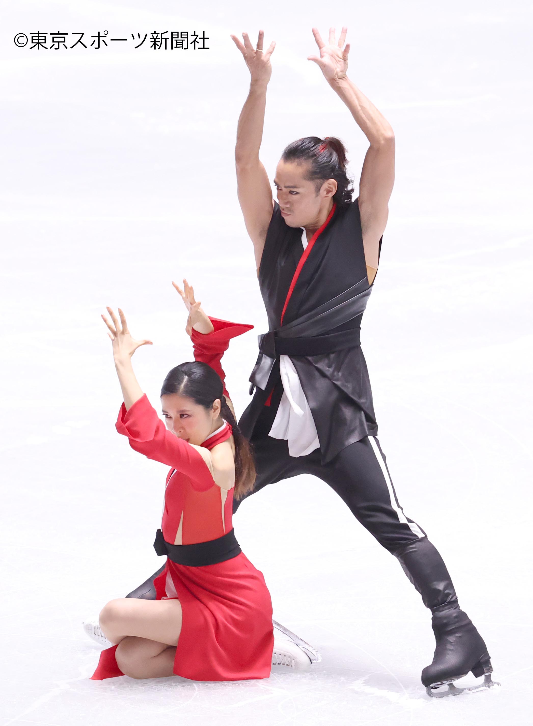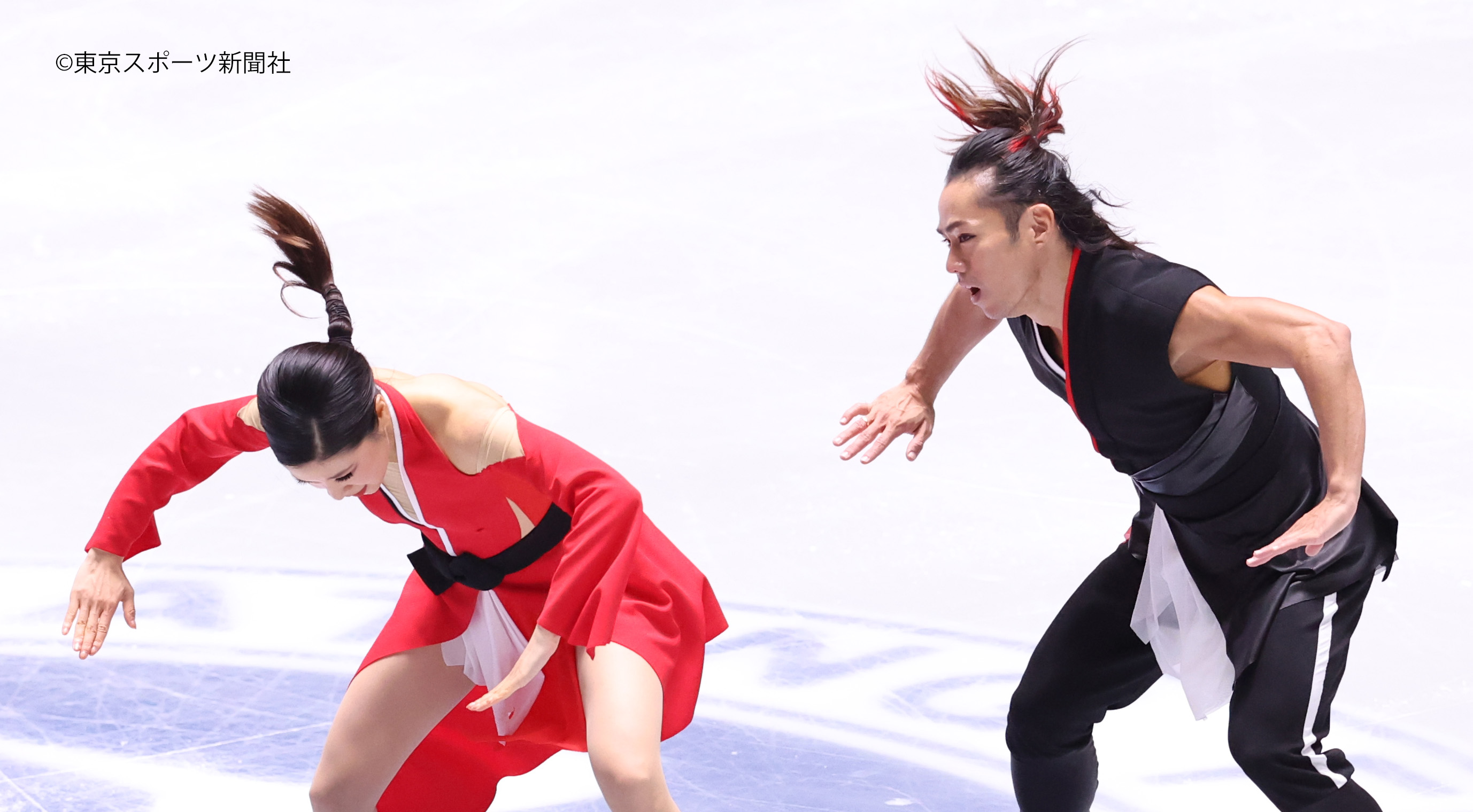 村元選手は赤、髙橋選手は黒の衣装。中盤は流しつつ、序盤とヒップホップの終盤は息のあった演技。