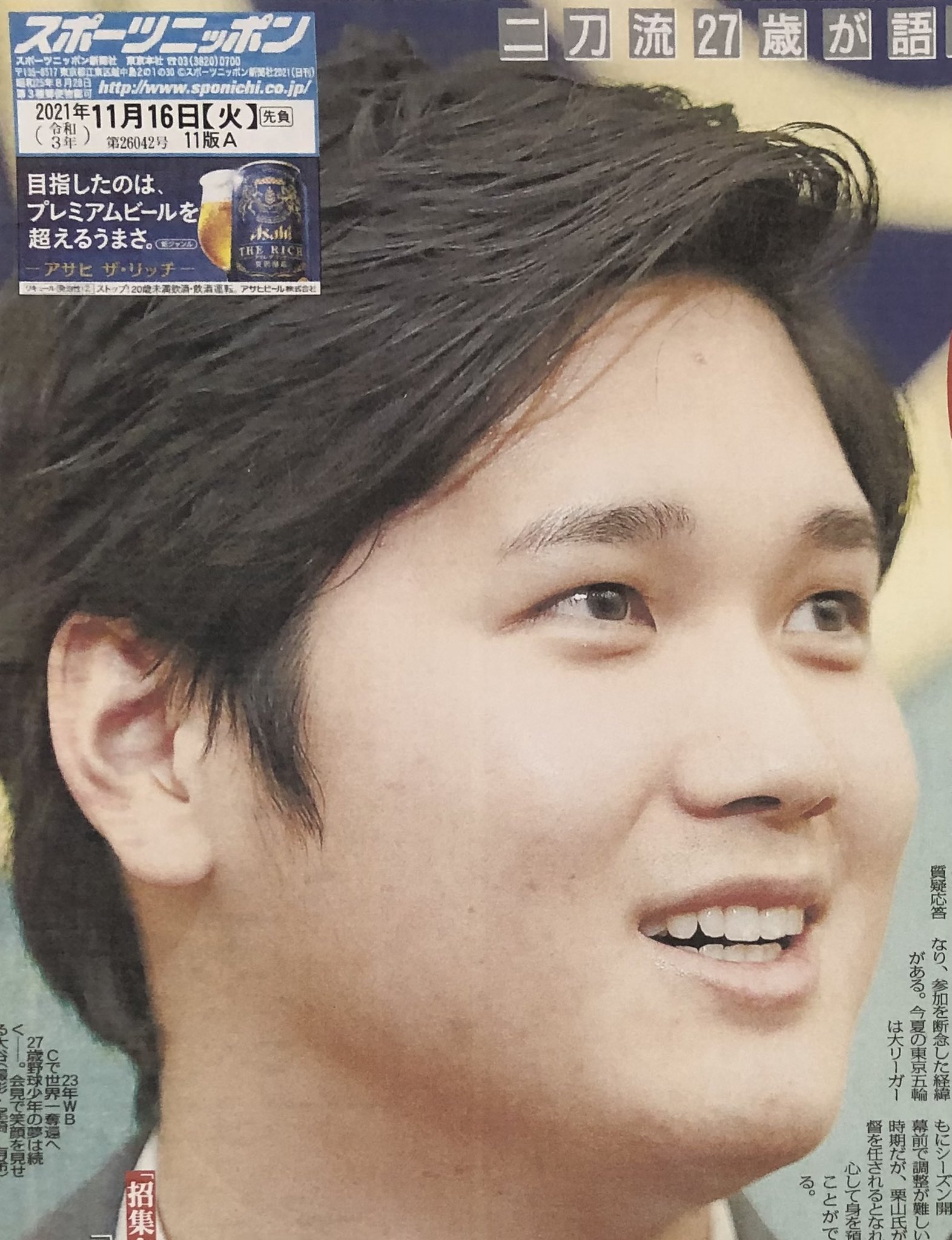 【告知】明日(というか本日)16日付 #スポニチ(東京最終版)は #エンゼルス #大谷翔平 選手の帰国会見で1〜3面で大展開しています。めちゃくちゃ爽やかな紙面に仕上がっています🇺🇸⚾️是非ご覧頂ければ幸いです🙇♂️ pic.twitter.com/DAIGTPXfoH