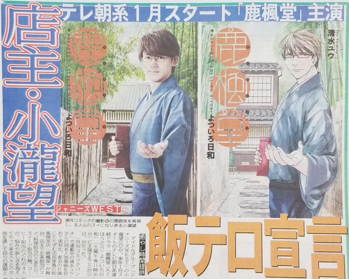 #ジャニーズWEST の #小瀧望 が来年1月スタートの #テレビ朝日 系連ドラ「鹿楓堂(ろくほうどう)よついろ日和」(土曜午後11時30分)に主演することが分かった。