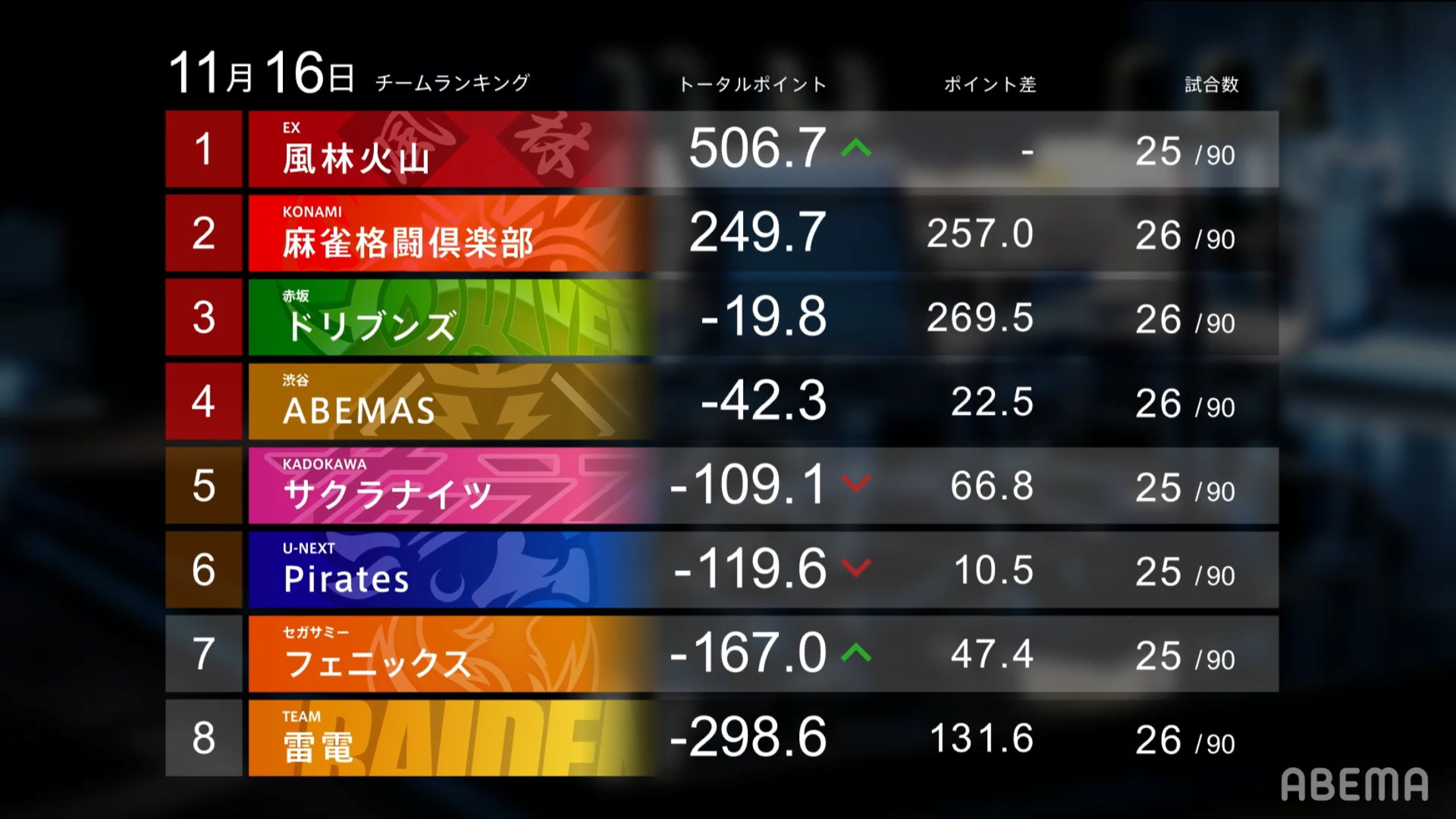 【#Mリーグ 結果】11/16(火)試合結果