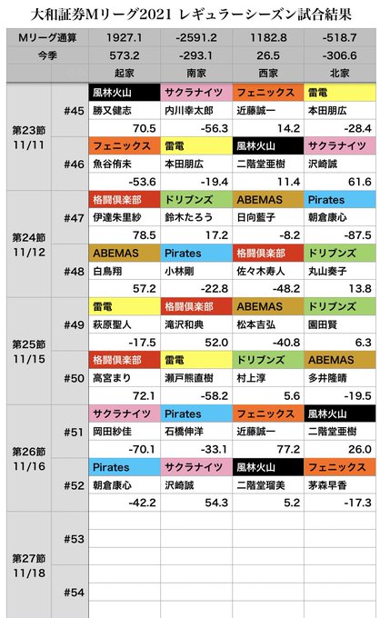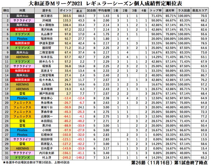 大和証券 #Mリーグ 2021【個人成績順位表】