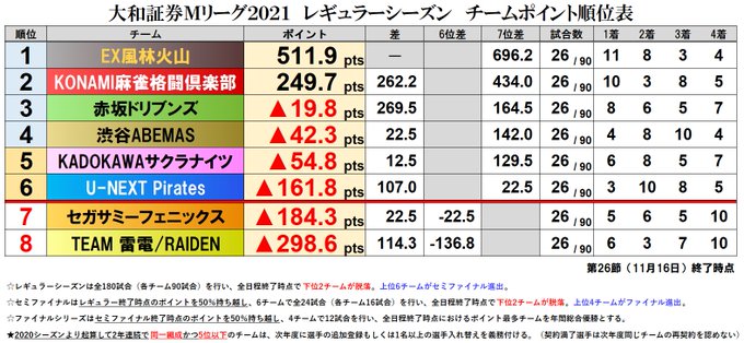 大和証券 #Mリーグ 2021【チーム成績順位表】