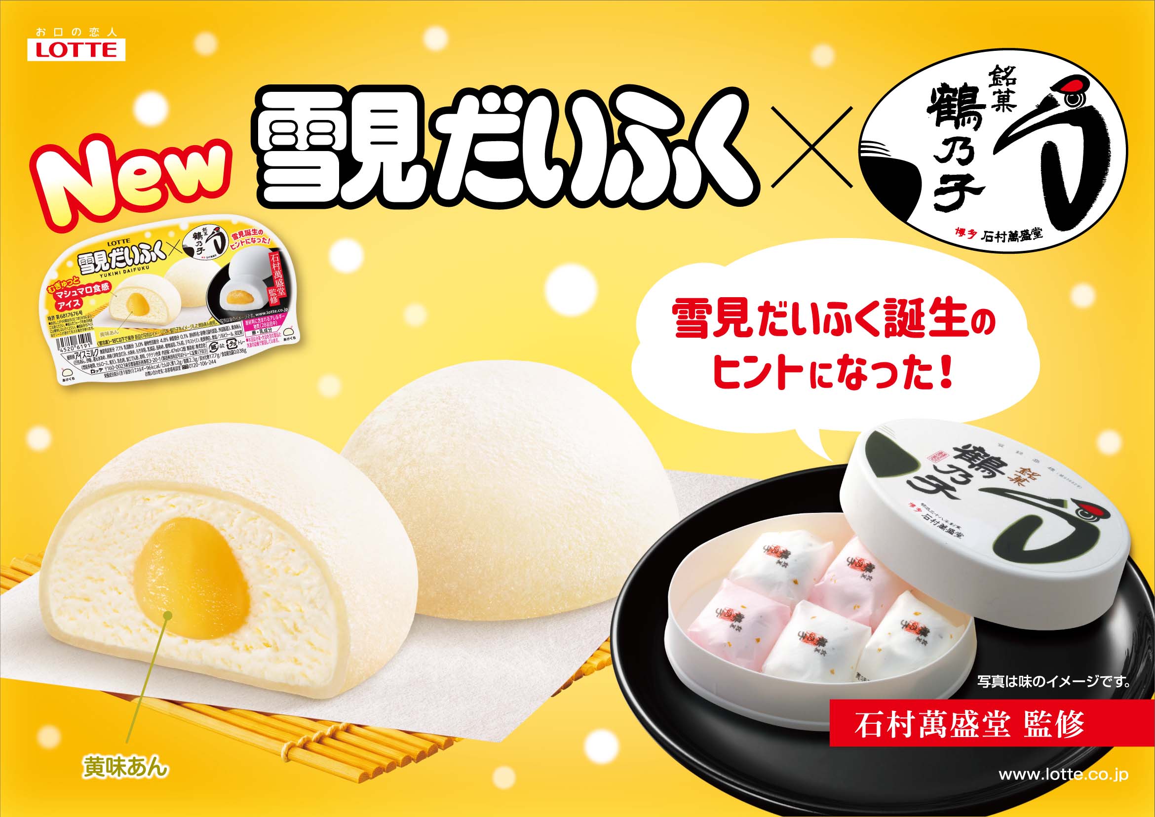 雪見だいふく発売40周年!夢のコラボ♪石村萬盛堂監修!ロッテ『雪見だいふく × 鶴乃子』やわらかいおもちの中にはマシュマロ風味&食感のアイス、さらに濃厚な黄味あん!博多銘菓「鶴乃子」の味わいをイメージした雪見だいふく。#雪見だいふくの日 pic.twitter.com/pGz40Zy9af