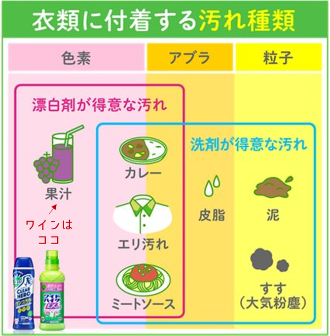ワインを万が一洋服やバスローブにこぼしてしまった場合、ワインのシミは色素汚れに分類されるので、酸素系漂白剤がよく効きます。ご安全に楽しい夜を。 pic.twitter.com/1LsLZd7ecz