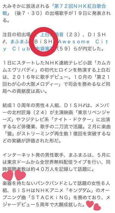 大みそかに放送される「第72回NHK紅白歌合戦」の出場歌手がきょう発表される。注目の初出場は、#上白石萌音、#DISH、#まふまふ、#BiSH、#AwesomeCityClub、#布袋寅泰 らが内定した。