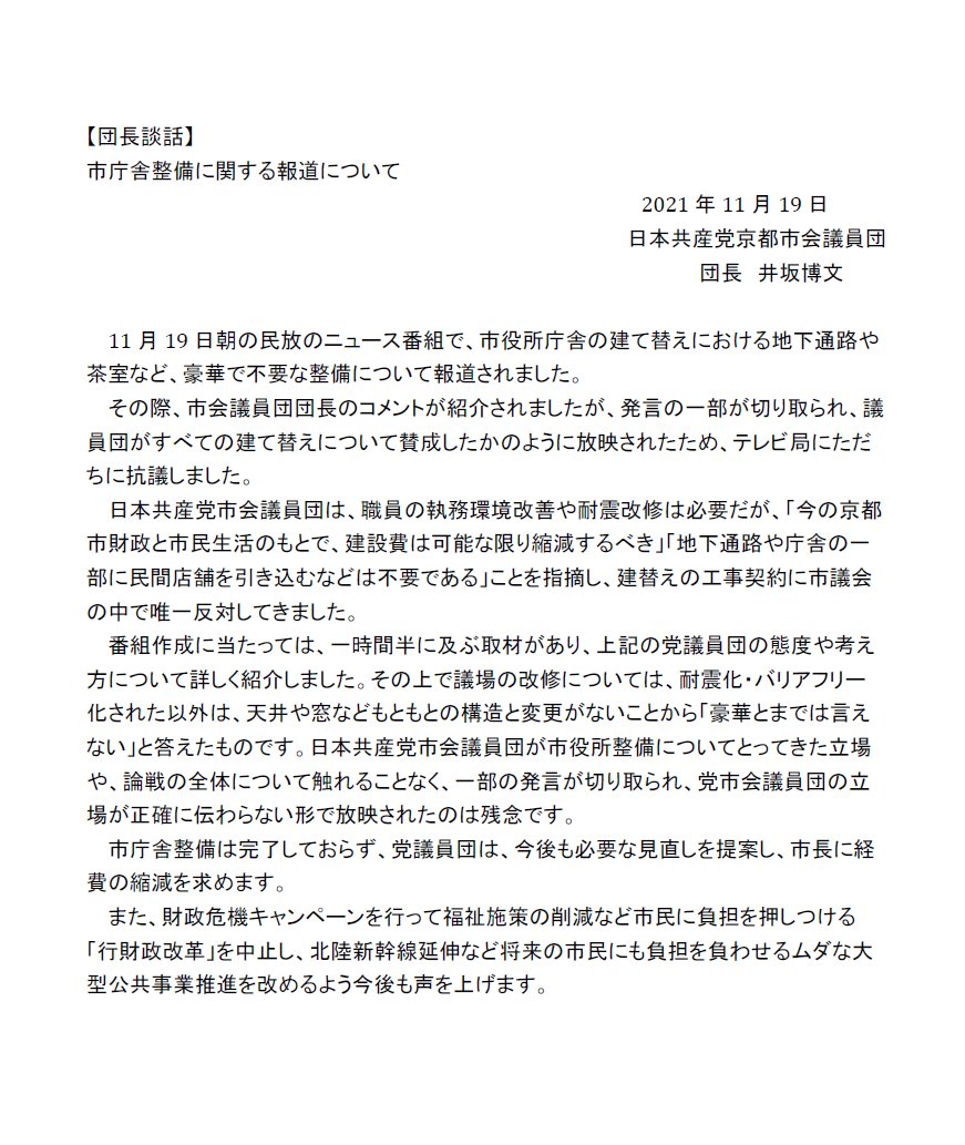 【団長談話】市庁舎整備に関する報道について - トピックス|日本共産党 京都市会議員団 cpgkyoto.jp/topic/2021/11/… pic.twitter.com/wPBnOaef1Y