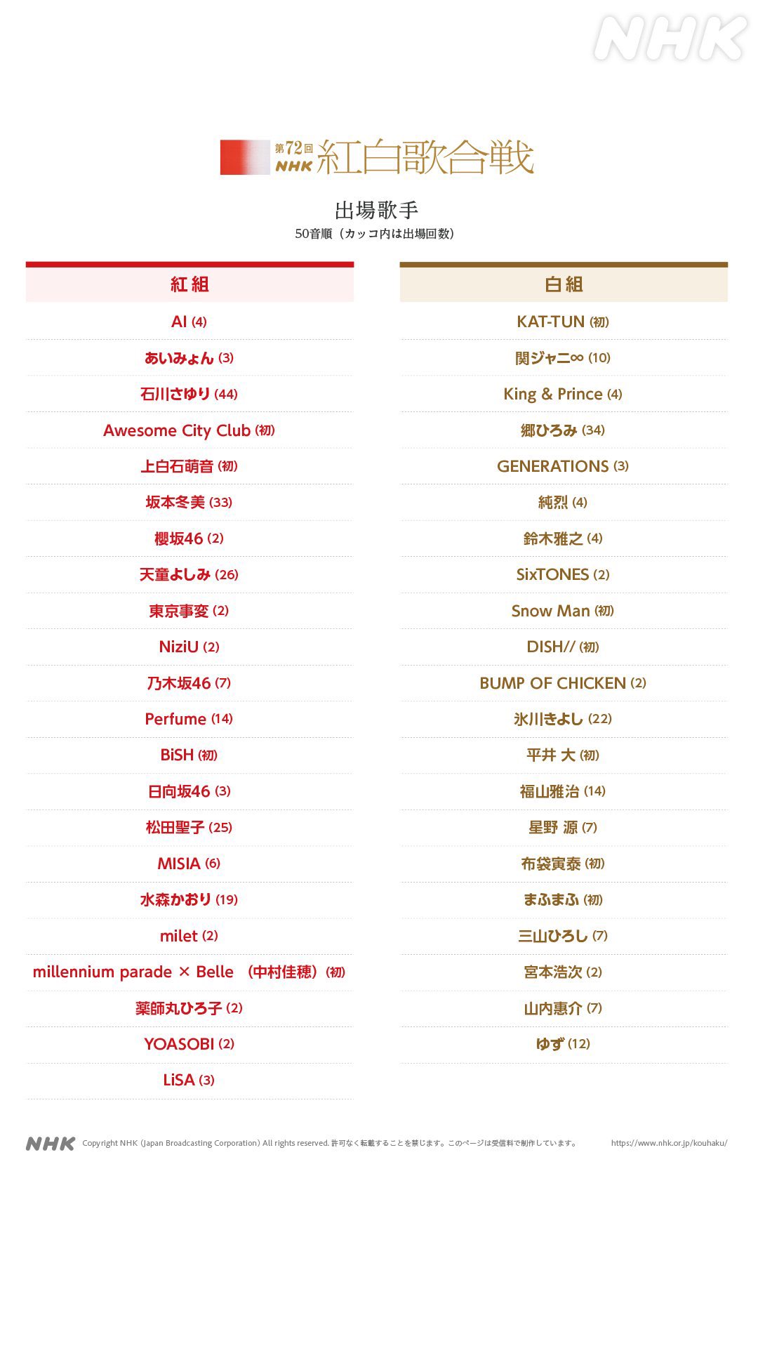 🎊 第72回NHK紅白歌合戦 出場歌手発表❗