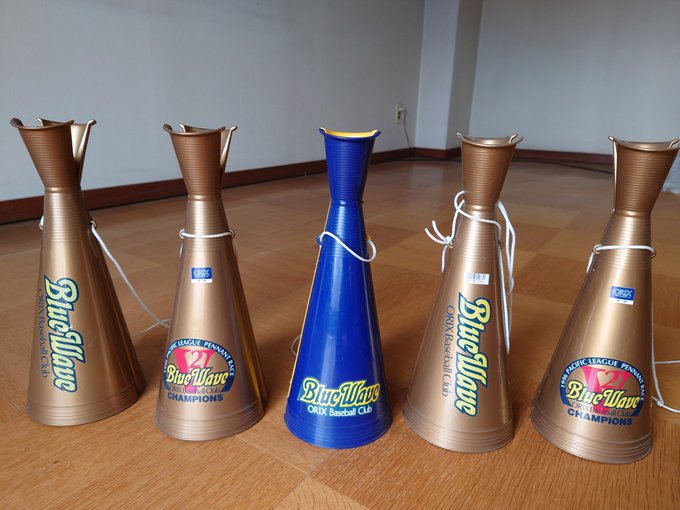 空き家にしている実家マンションに25年置いてあったメガホン。真ん中はリーグ優勝試合で使ったもの。 シリーズは毎日新品を買って、勝ったら保存、負けた第三戦だけゲン直しのために捨てた。なので4本。