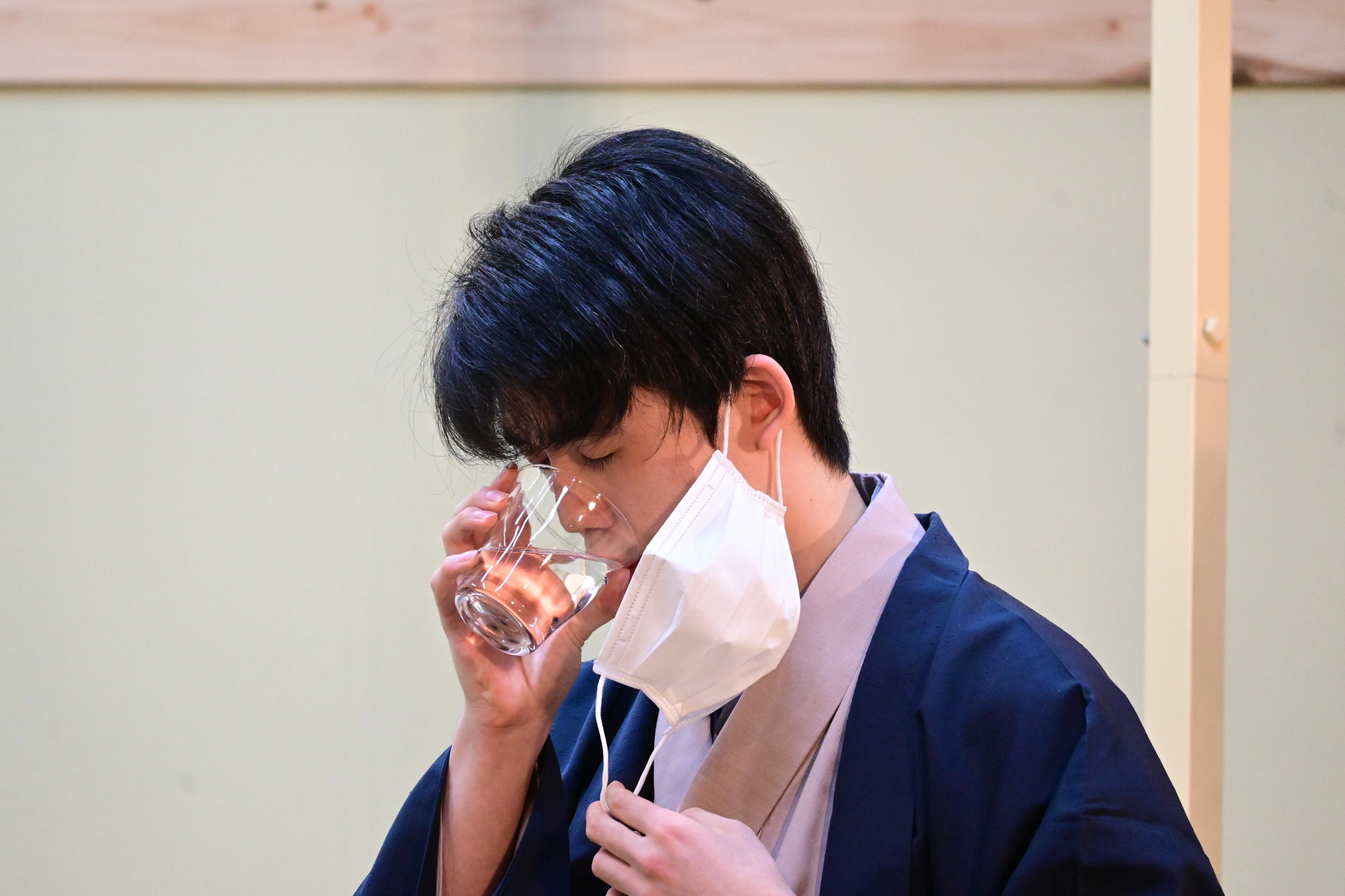 昨年の大会覇者の豊島九段が駒袋を開けました。早指し対局ゆえ、藤井竜王は超高速で水を飲んで、2手目を指しました。