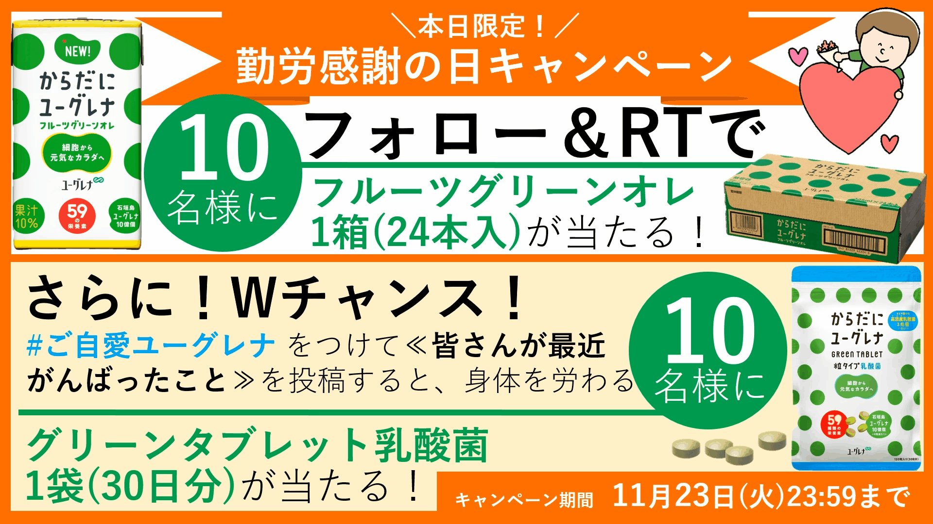 さらに #ご自愛ユーグレナ をつけて≪最近がんばったこと≫をツイートすると、グリーンタブレット乳酸菌1袋が【10名様】に当たる🎁