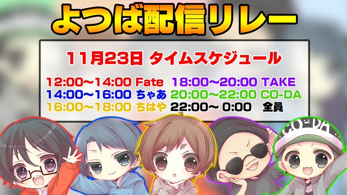 #よつば配信リレー [2021年11月23日(火)] 2021年11月23日(火)19:30当ページのリンクには広告を含む場合があります 2021年11月24日(水) 01:30 更新 ちゃあ/chaa's @semiritaiya 今日はイイネしまくるわ #よつば配信リレー #ばぶばぶGames ちゃあ/chaa's @semiritaiya 14時からは俺の番!!【夢は視聴者参加型】Robloxでイカゲーム!!【よつば配信リレー】#よつば配信リレー #Mildom mildom.com/11652371?ts=16… Fate Games@ふぇいなー @FateGames1 ちゃあさん後は頼んだぞーーー!!!!!!!!!◦<(¦3[▓▓]#よつば配信リレー CO-DA(コーダ)🐻 @codaryu いまだに何しようか悩んでんだけどwwww#よつば配信リレー twitter.com/yotsuba_guild/…よつばぎるど公式🍀 @yotsuba_guild 11月23日によつば配信リレーをするよ!これがタイムスケジュールなので、是非みんな遊びに来て配信を一緒に盛り上げよう!🍀#よつばぎるど pic.twitter.com/NCIhmbmmQH たけ/TAKE @take_chan_nel #よつば配信リレー いやぁ、12時間あっちゅーまだったぁ!楽しかった!みんなありがとう!!! twitter.com/yotsuba_guild/…よつばぎるど公式🍀 @yotsuba_guild 今日はみんな見てくれてありがとう!✨とても楽しく配信リレーが出来ました!来月は僕達5人のマイクラ楽しみに待っててね🍀!!!本当にありがとうございました!! コメント名前 コメント 投稿する