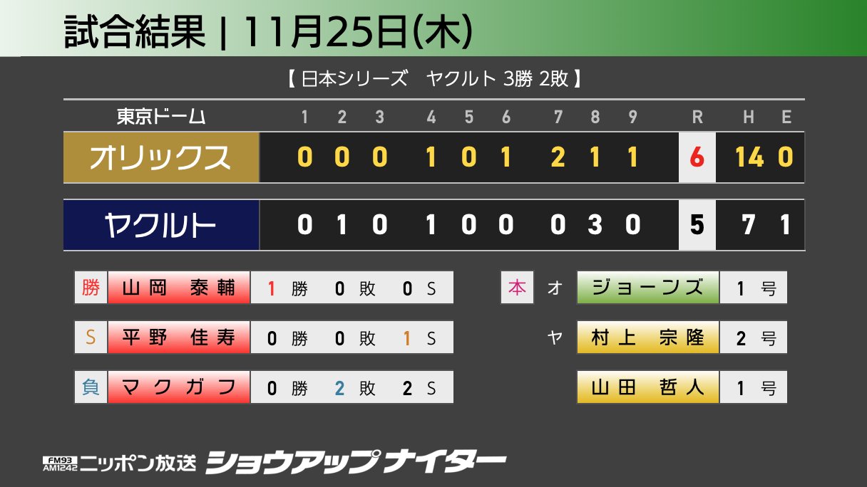 【 #ヤクルト 5-6 #オリックス 】日本の主砲 #山田哲人 のホームランでヤクルトが同点に追いつくも、アメリカの主砲 #ジョーンズ の一発でオリックスが接戦を制する。決戦は神戸へ⚓️