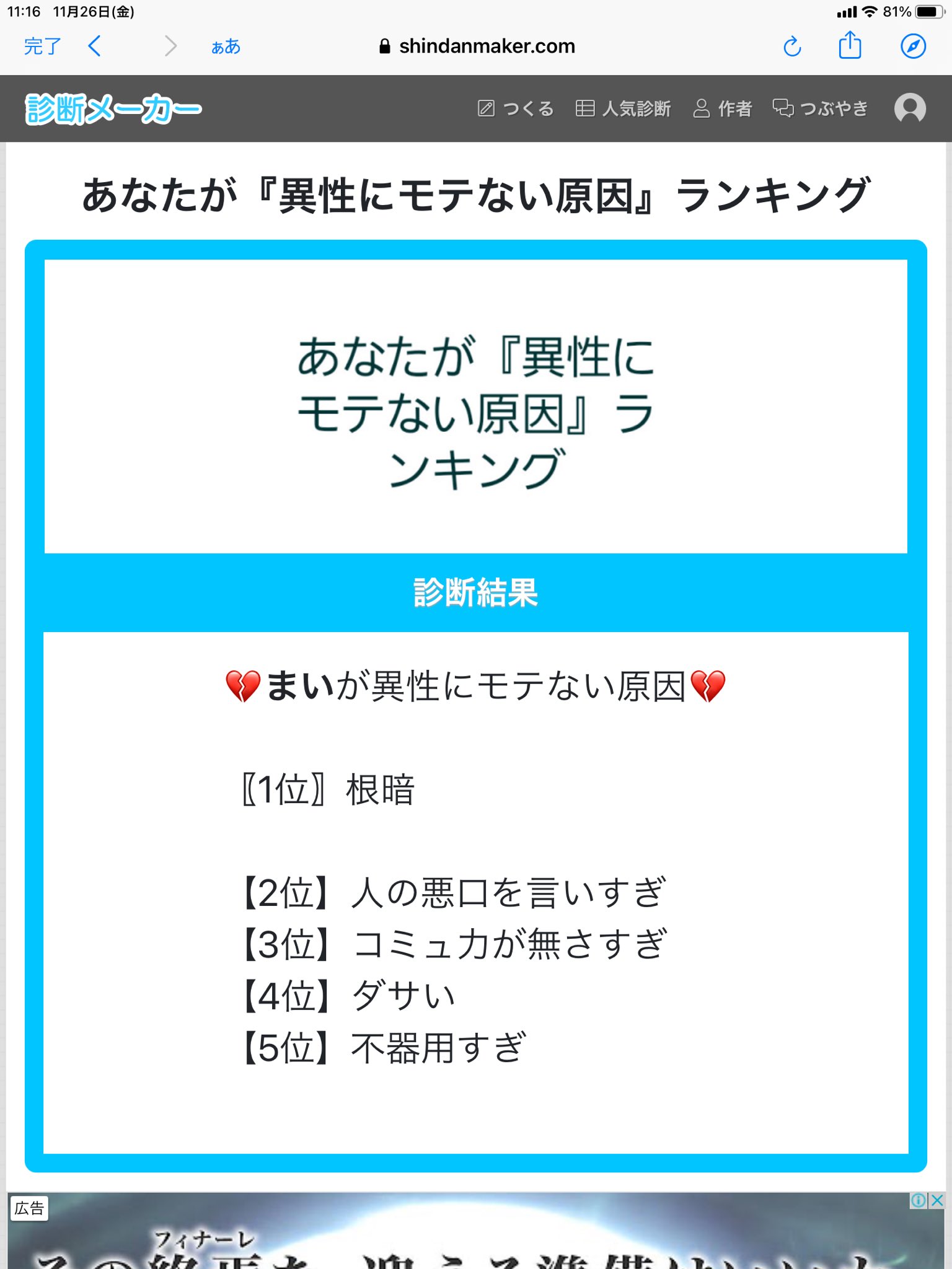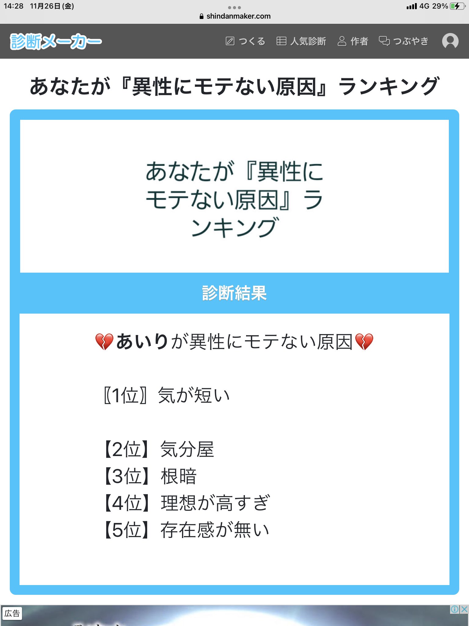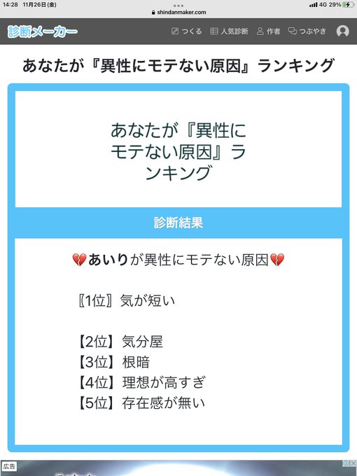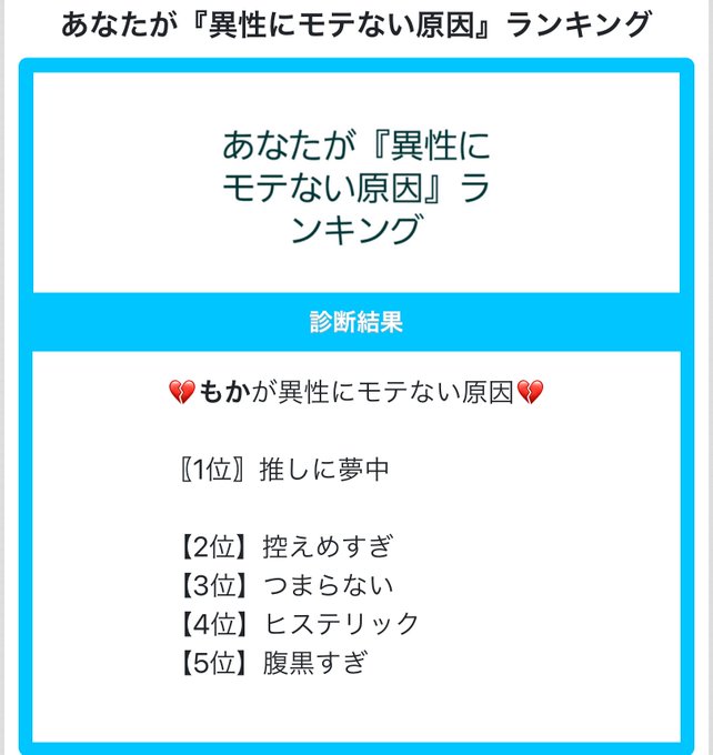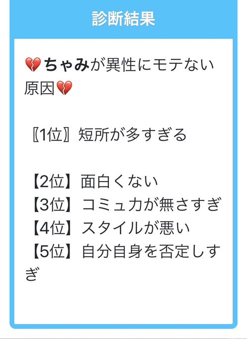 #shindanmaker #異性にモテない原因ランキング pic.twitter.com/4Ap36X6KBx