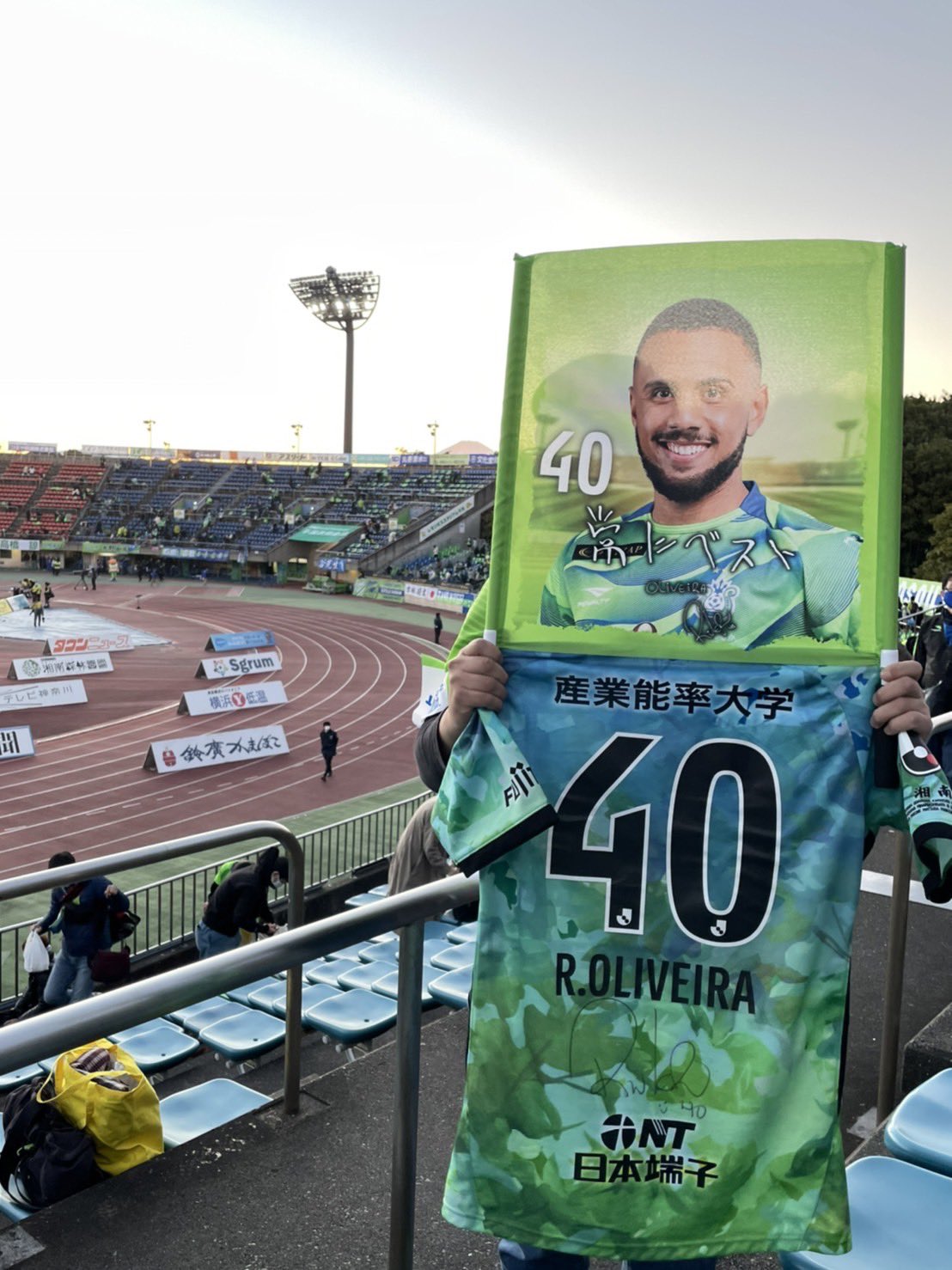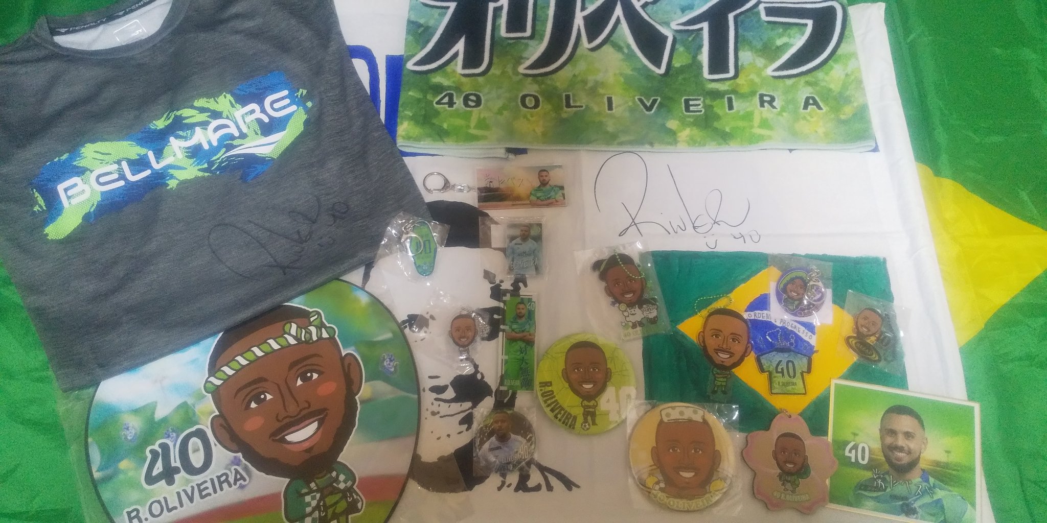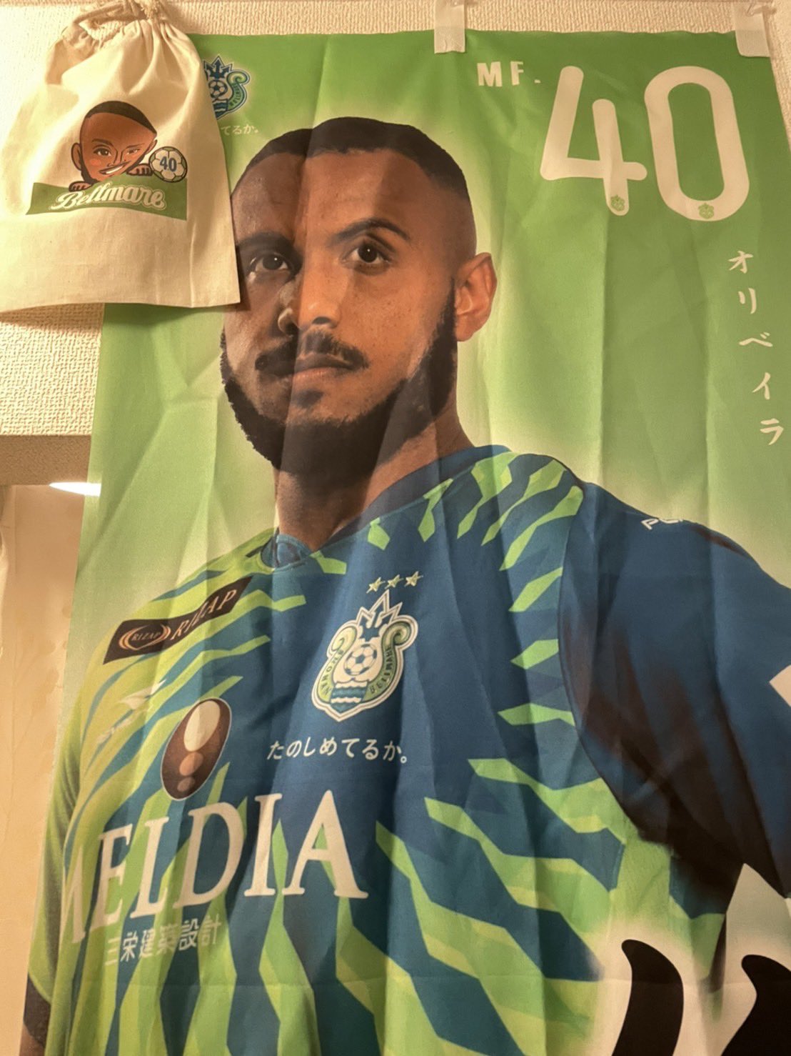 試合後にオリベイラ選手のゲーフラ、ユニフォーム、タオルで写真撮影しました✨