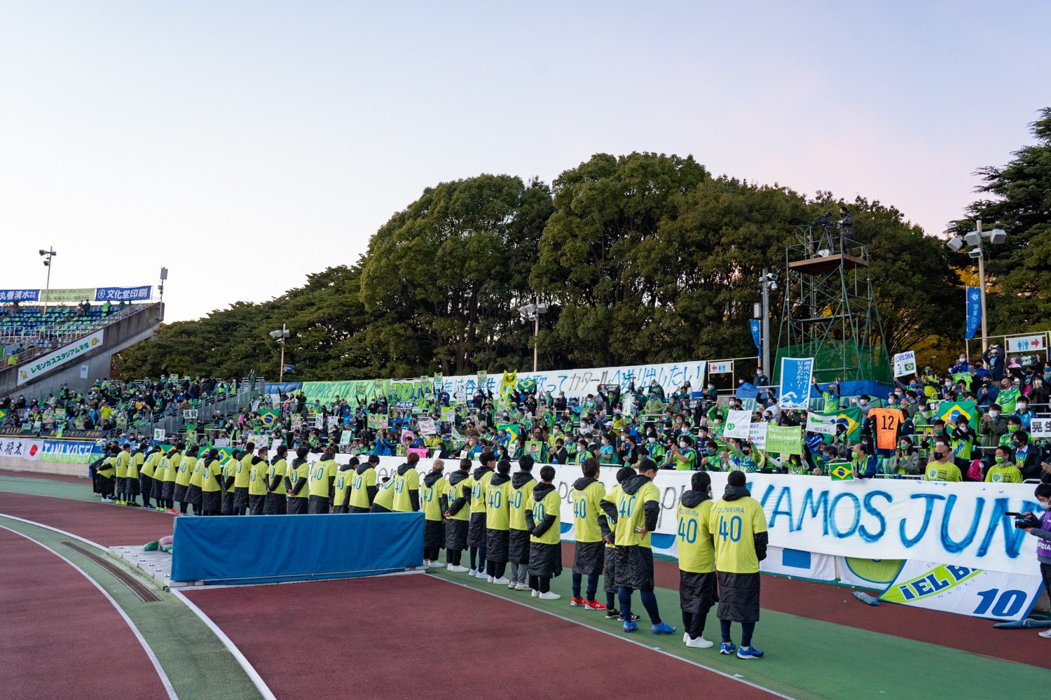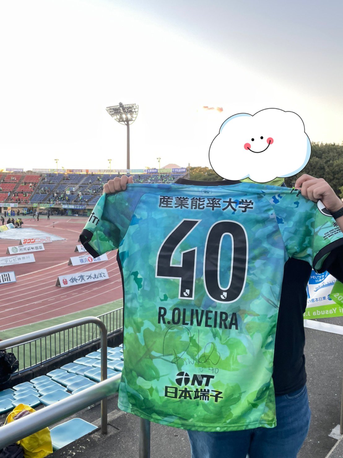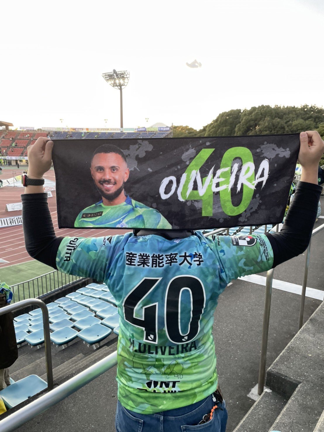 試合後にオリベイラ選手のゲーフラ、ユニフォーム、タオルで写真撮影しました✨