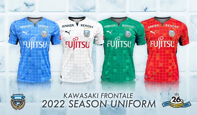 来年"26(フロ)周年"を迎える2022シーズンのユニフォームはお風呂にあるタイルからインスピレーションを受けたデザインとなります♨️26周年ロゴも合わせて製作し、ユニフォームへ反映しました🐬選手やサポーターの皆様が早く袖を通すのが楽しみです🙌【アズーロ・ネロ】#frontale pic.twitter.com/6hH8jzN9HP
