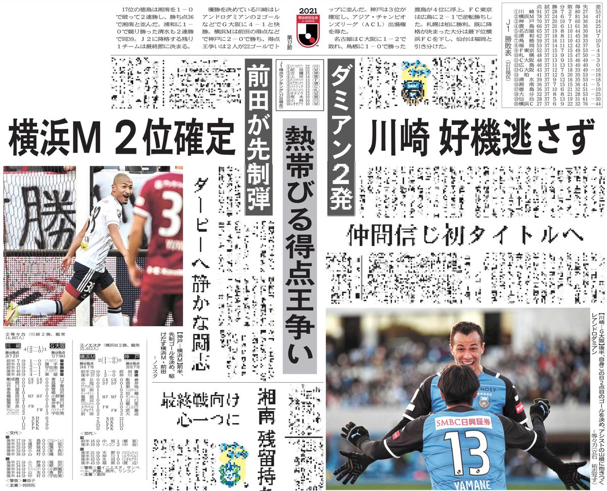 おはようございます。今朝のスポーツ面は熾烈な得点王争いが続くサッカーJ1を詳報しています。横浜Mの #前田大然 選手と川崎の #レアンドロダミアン 選手が22得点でトップに並び、最終節の直接対決を迎えることになりました。#frontale #fmarinos