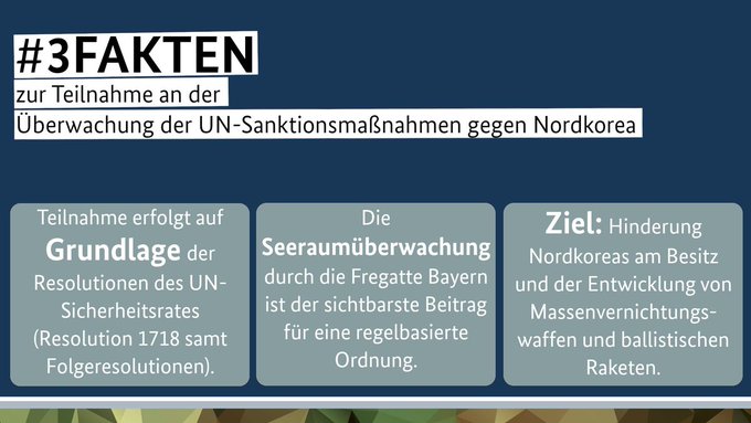 Bis Mitte Dezember beteiligt sich unsere @FregatteBayern an der Überwachung der UN-Sanktionen gegen Nordkorea. Gemeinsam mit 🇺🇸🇨🇦🇯🇵🇰🇷🇦🇺🇳🇿🇬🇧🇫🇷 leistet 🇩🇪 einen aktiven Beitrag für Sicherheit und Schutz im #IndoPazifik. Unsere #3Fakten: pic.twitter.com/iHl1NULlFz