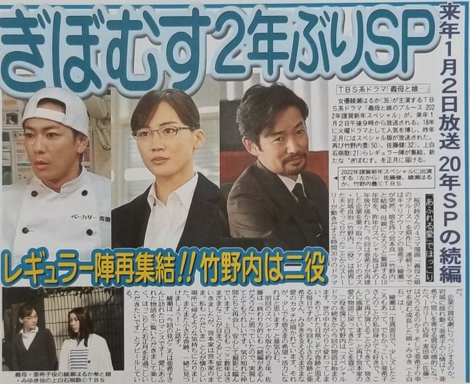 2022年1月2日(日)21時からTBSで #綾瀬はるか さん #竹野内豊 さん #佐藤健 さんたちが出演する『義母と娘のブルース 2022年謹賀新年スペシャル』が放送されることに✨