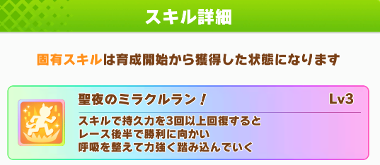 ・固有はレース後半で3回以上回復すると発動
