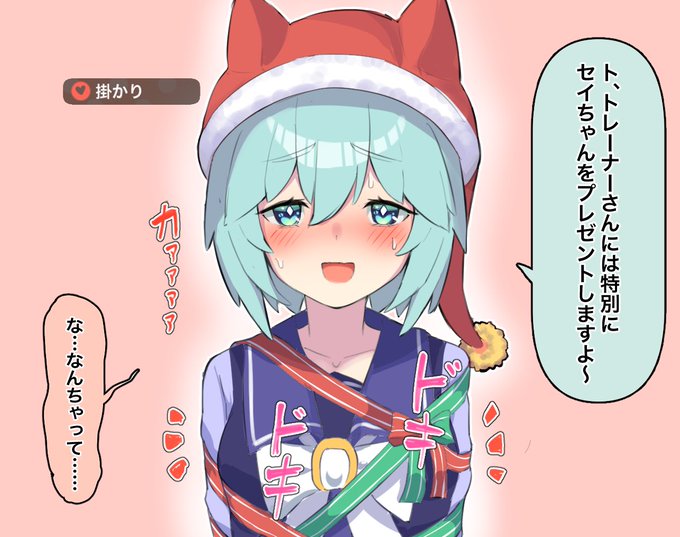 自分をプレゼントすることでトレーナーをからかおうと思っていたが途中で恥ずかしくなり今すぐに逃げ出したいと思っているサンタセイちゃん
