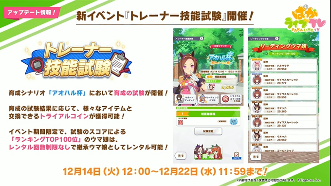 試験のスコアランキングTOP100のウマ娘は期間中レンタル制限なしでレンタルが可能に!